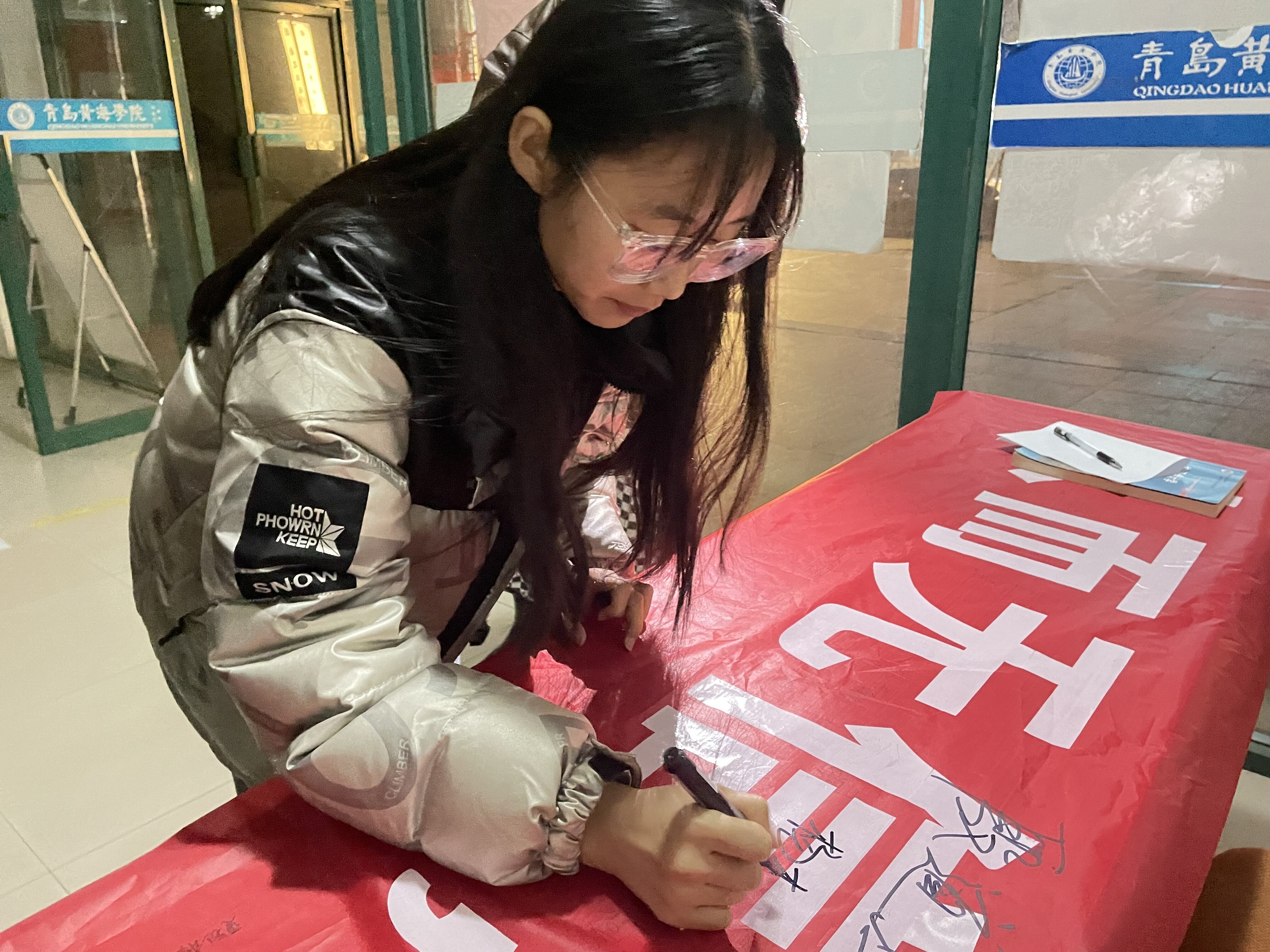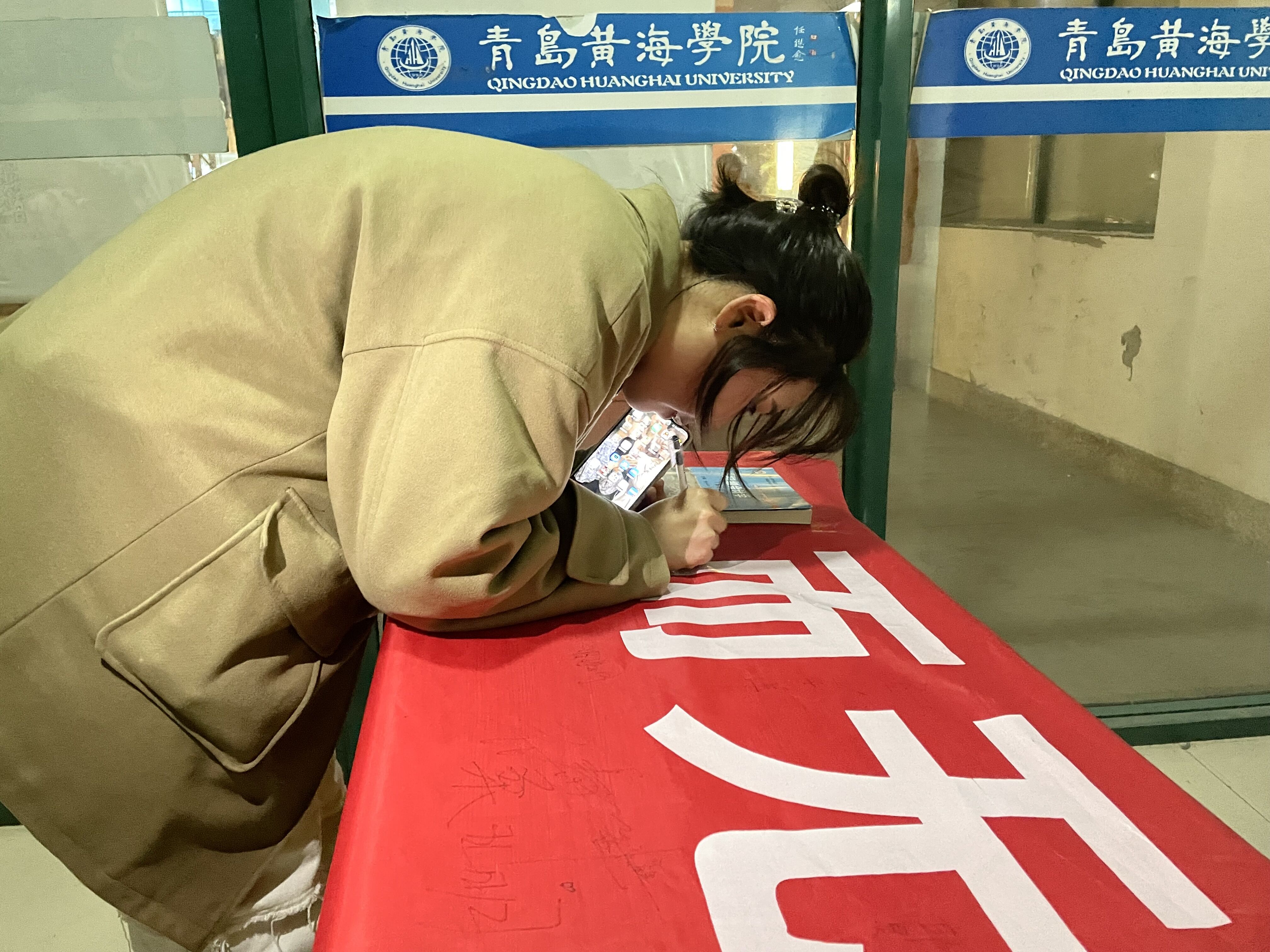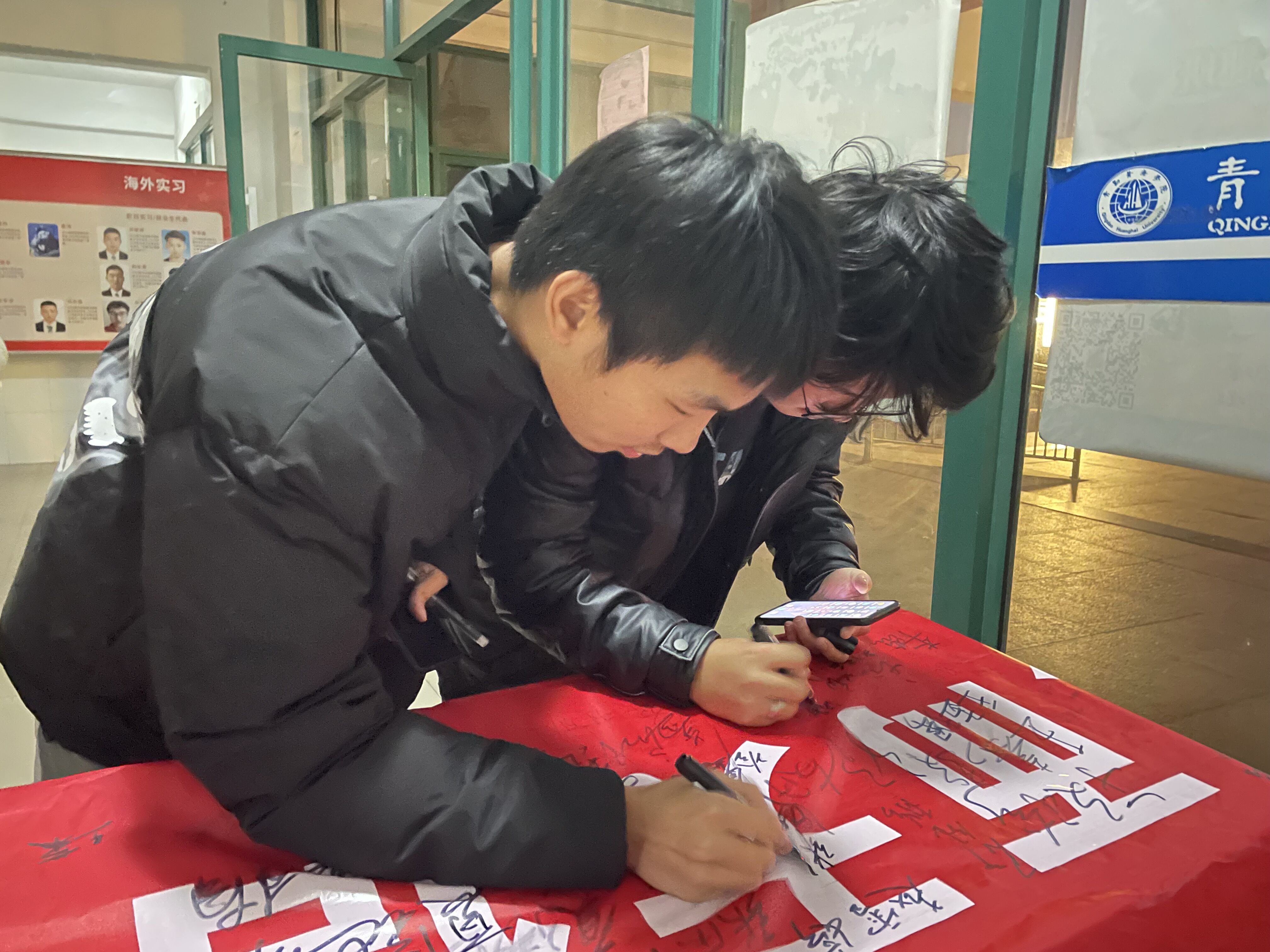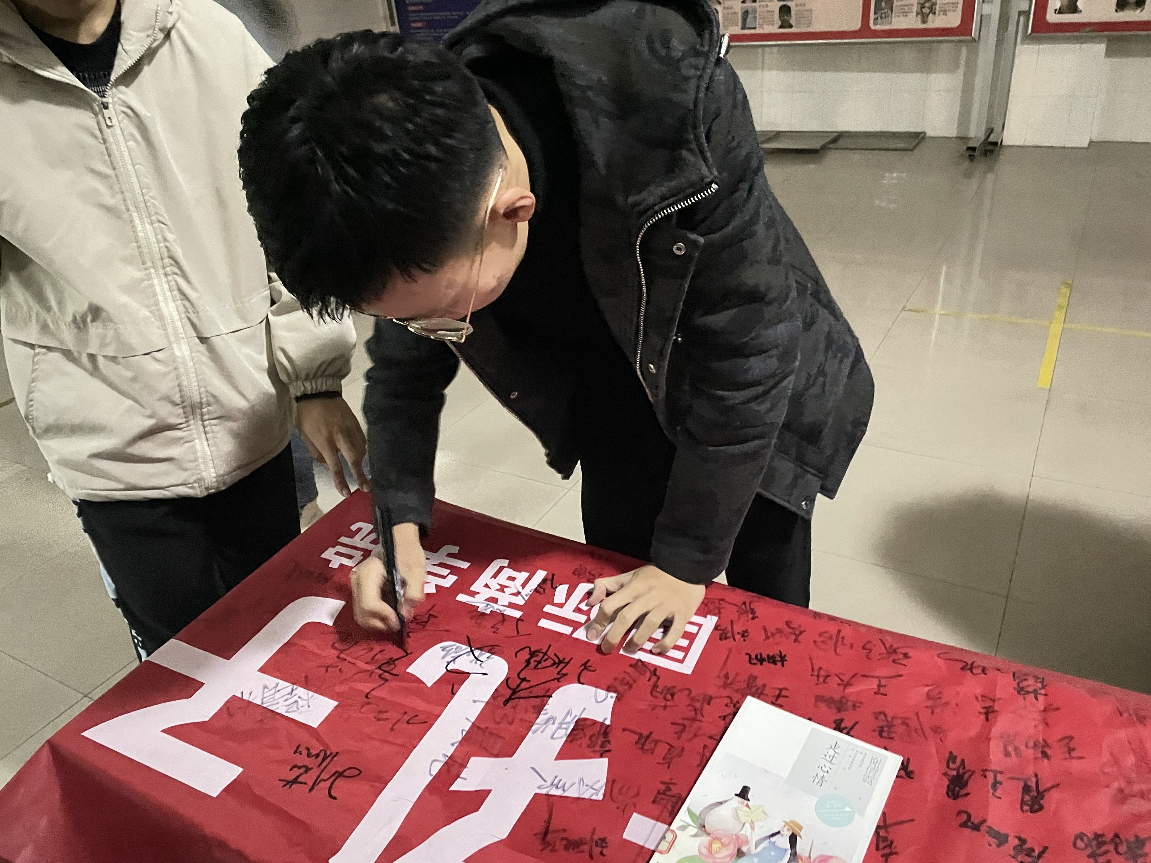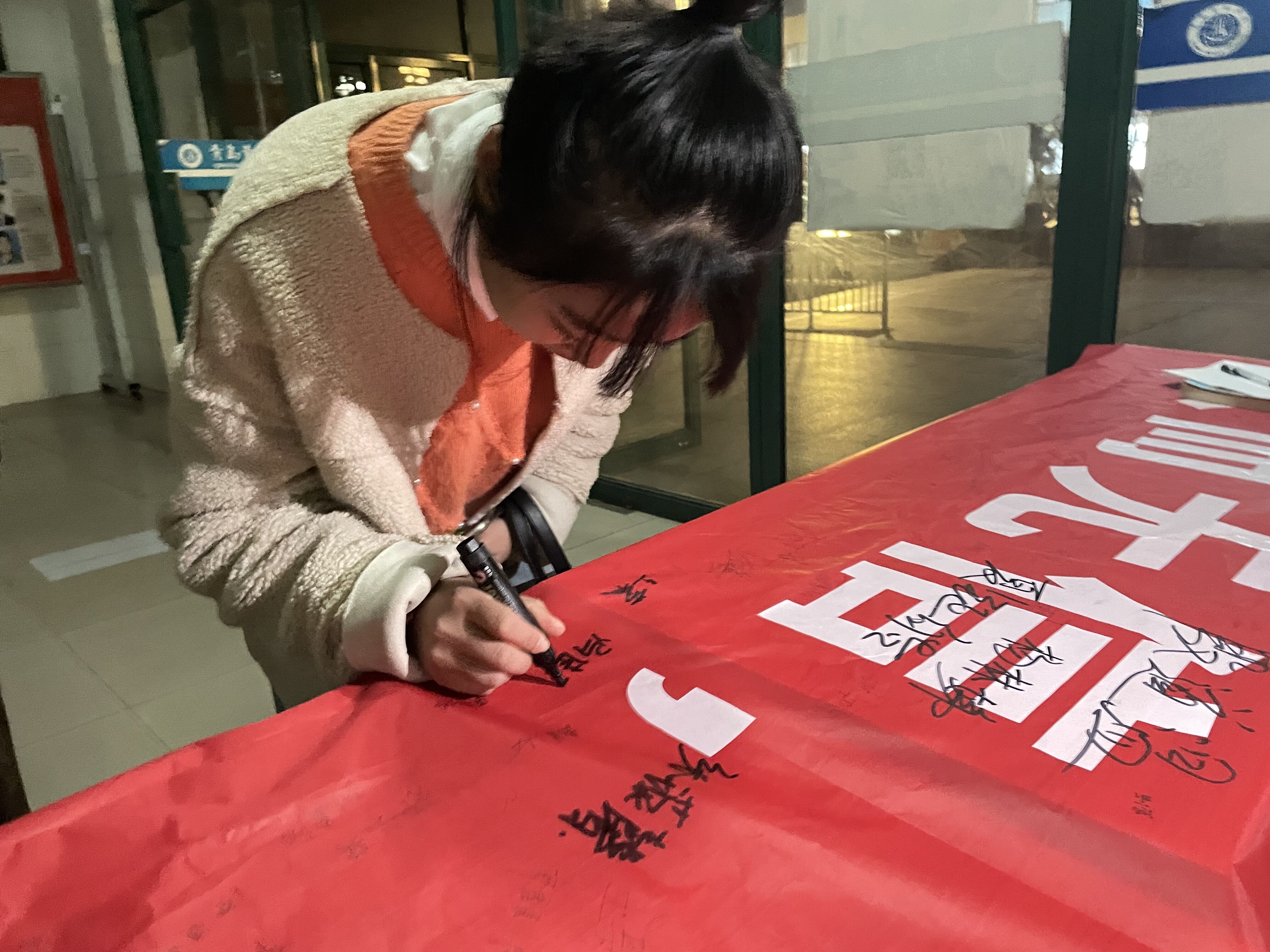 “人而无信,不知其可也。”孔子对后世的教诲印在鲜红的五米横幅上。同学们来到签字台上,用记号笔庄重的写下了自己的名字,表明了自己拒绝作弊诚信迎考的决心。同时,晚自习期间同学们也签下了诚信考试承诺书,白纸黑字,并不只单单代表着一个名字,更是当代大学生基本道德的体现。