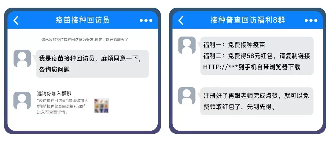 诈骗分子伪装成疫苗接种人员,进行虚假的回访调查。将其拉入群里后,散发虚假福利信息,千万不要点开任何链接!!那极有可能是骗子制造的手机病毒,一旦点开,所有信息会立刻转存到骗子的电脑中!