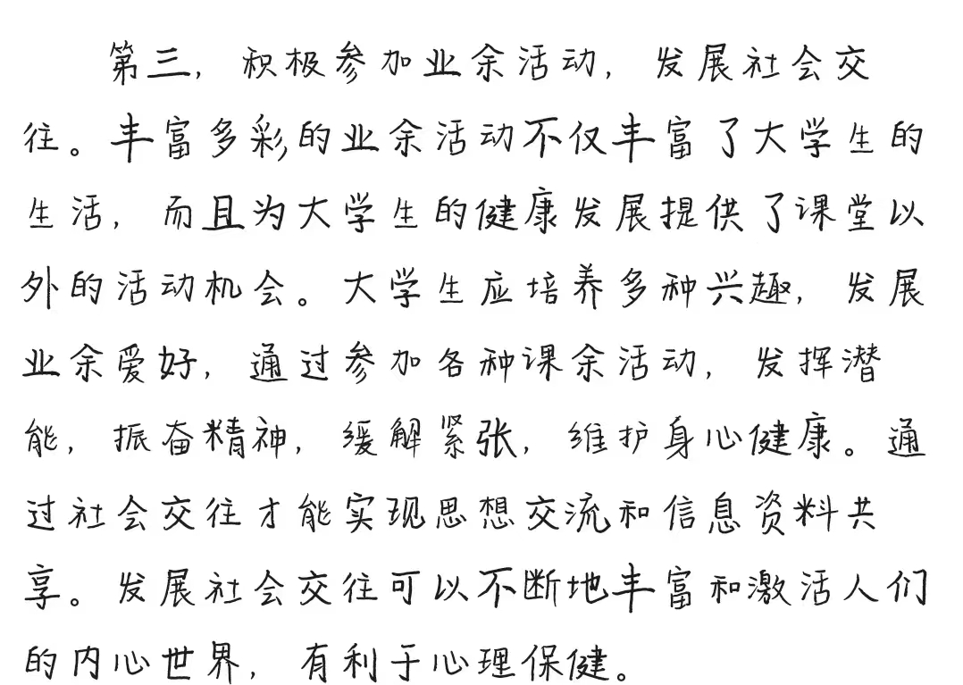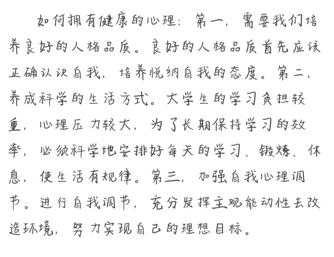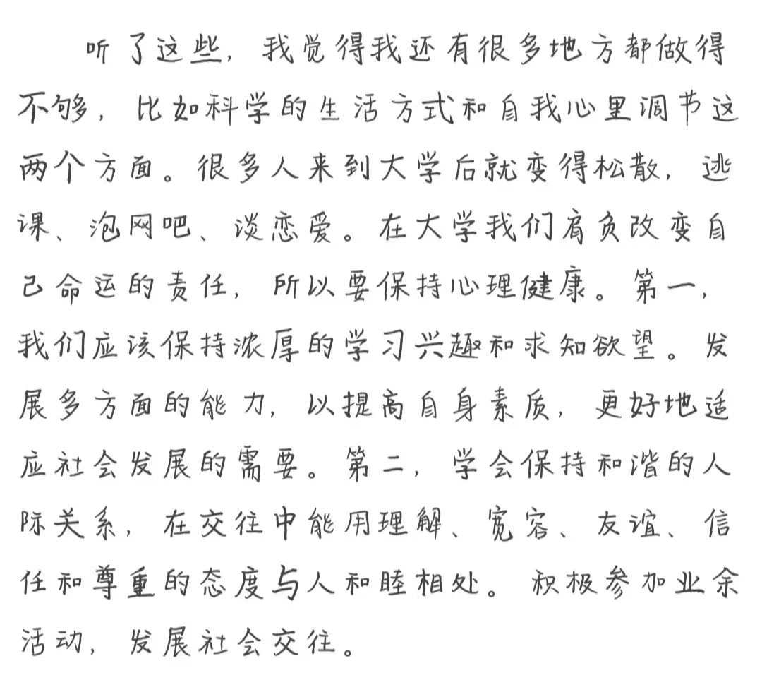 健康是人的第一财富,是人生发展的基础。我们更应该树立科学的健康意识,重视身心健康,维护和增强自身的心理健康,培养优良的心理素质,提高自我的心理调适能力,为学习、生活和工作奠定良好的基础。为此,我们要保持情绪正常,认知合理,正确把握自己,积极适应新的环境和主动与人沟通交流。