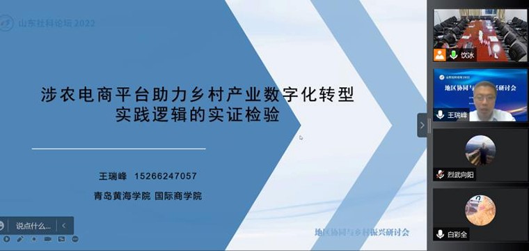 此次研讨会有来自山东大学、中央财经大学、吉首大学、山东财经大学、青岛科技大学、聊城大学、湖南农业大学、湖南工商大学、邵阳学院、福建社会科学院、中共玉林市委党校等14所高校、党校和社科院所的100余名专家学者通过线上或线下方式参加研讨会。我校国际商学院副院长王瑞峰博士,在研讨会上以《涉农电商平台助力乡村产业数字化转型实践逻辑的实证检验》为题做主旨报告。