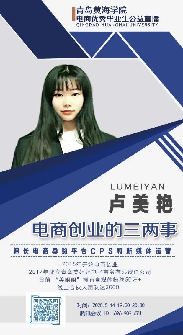 卢美艳,青岛黄海学院2018届电子商务专业毕业生,2015年开始电商创业,2017年成立美姐姐电子商务有限责任公司,擅长电商导购平台CPS和新媒体运营。目前拥有自媒体粉丝50万。