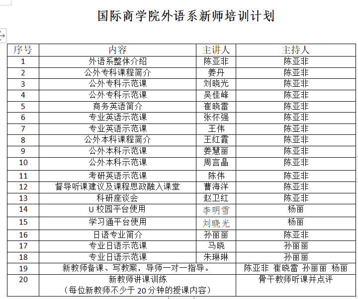 通过外语系全体骨干教师的辛勤付出,新师们深深感受到了外语系团结向上的氛围,他们不仅学习到了专业先进的教学方法,也更加明确了高校教师的职责与使命。相信在骨干教师的帮助下,新教师能够顺利推进工作,努力成长为外语系有能力、有担当的新生力量。
