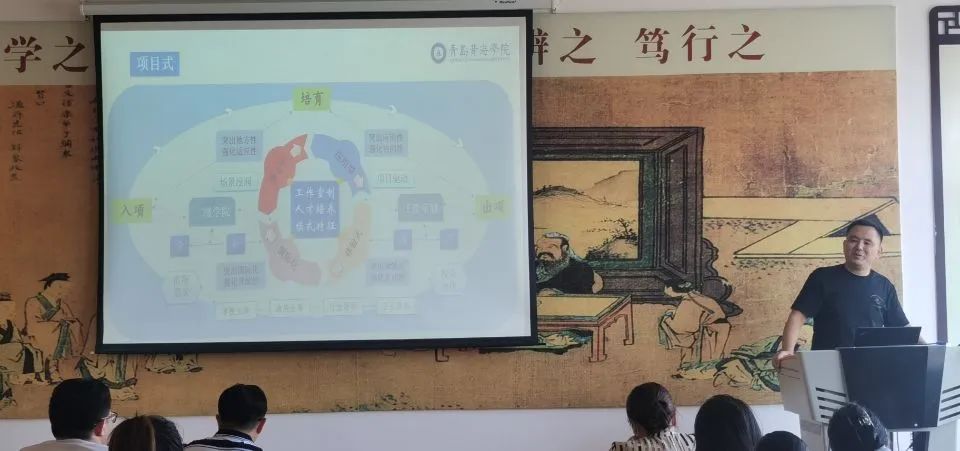 在产教融合的大背景下,于老师根据自身科研经历,建议教师们要有清晰的自我认知——找的准“门道”、耐得住“煎熬”、经得起“推敲”:学习成功者的长处,提出自己的创新点;学会思考如何利用专业优势和结合国家时政来做出相关的科研项目;学会研习国家相关最新政策的具体含义,理解最新形势,把握正确的思路。于老师以“四文化育人”为例就如何探究“一主线四融合”的文化育人模式做了案例式说明。