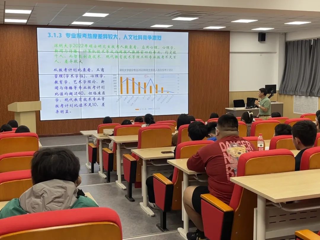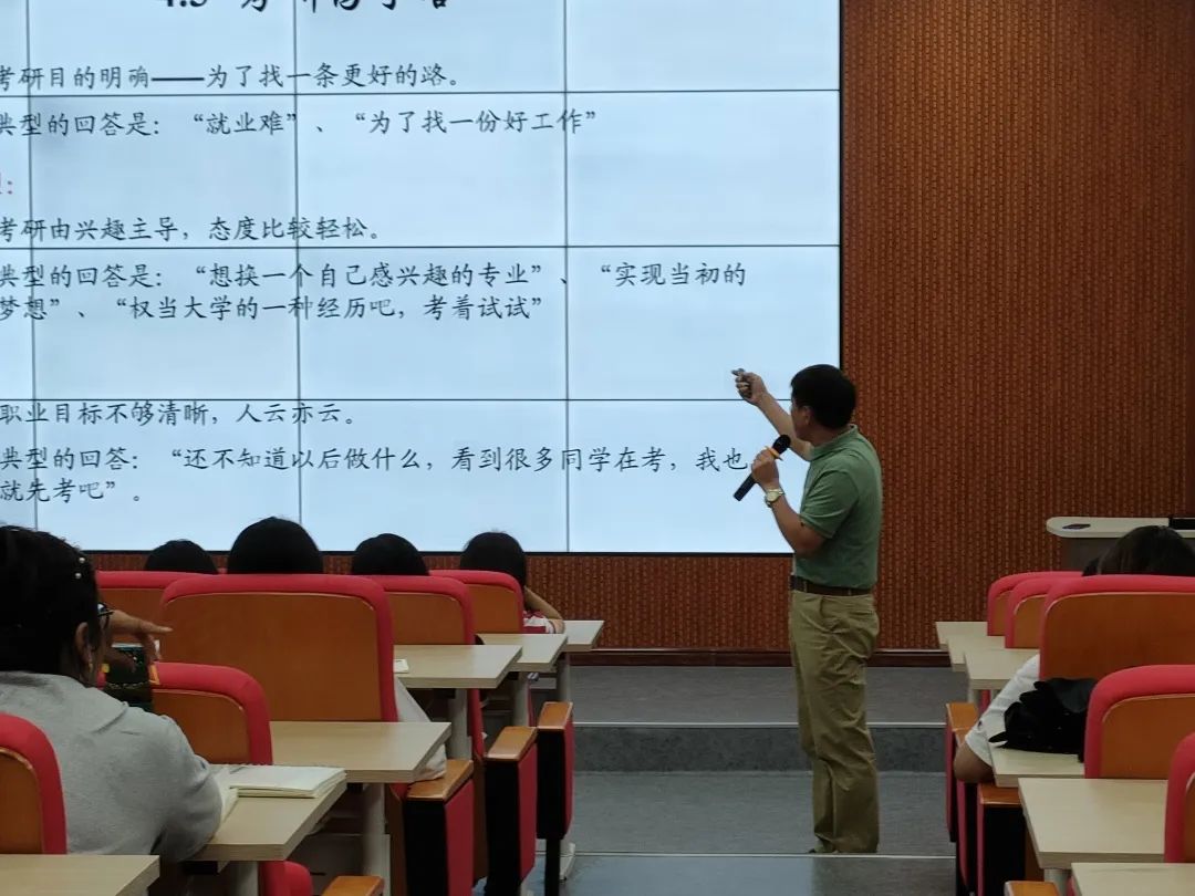 随后,刘教授向同学们分析了现在的考研热、考研优势并介绍了研究生招生、考试、录取的相关规定。明确了当前就业竞争加大,内卷加剧,研究生学历成为刚需等的形势,他鼓励同学们认真备考,明确自己的方向,树立高远的目标,尽自己的努力,考取一所满意的院校。