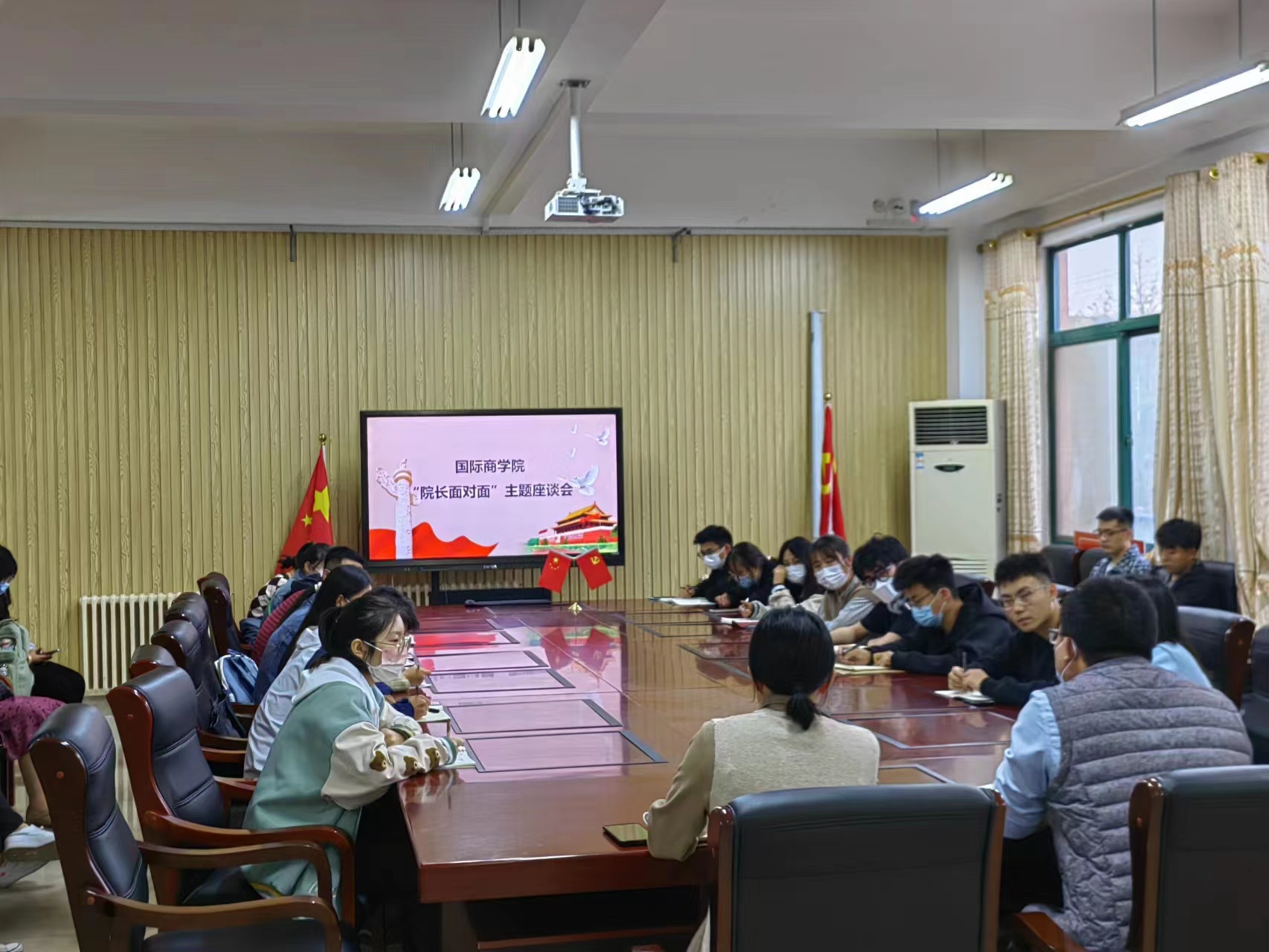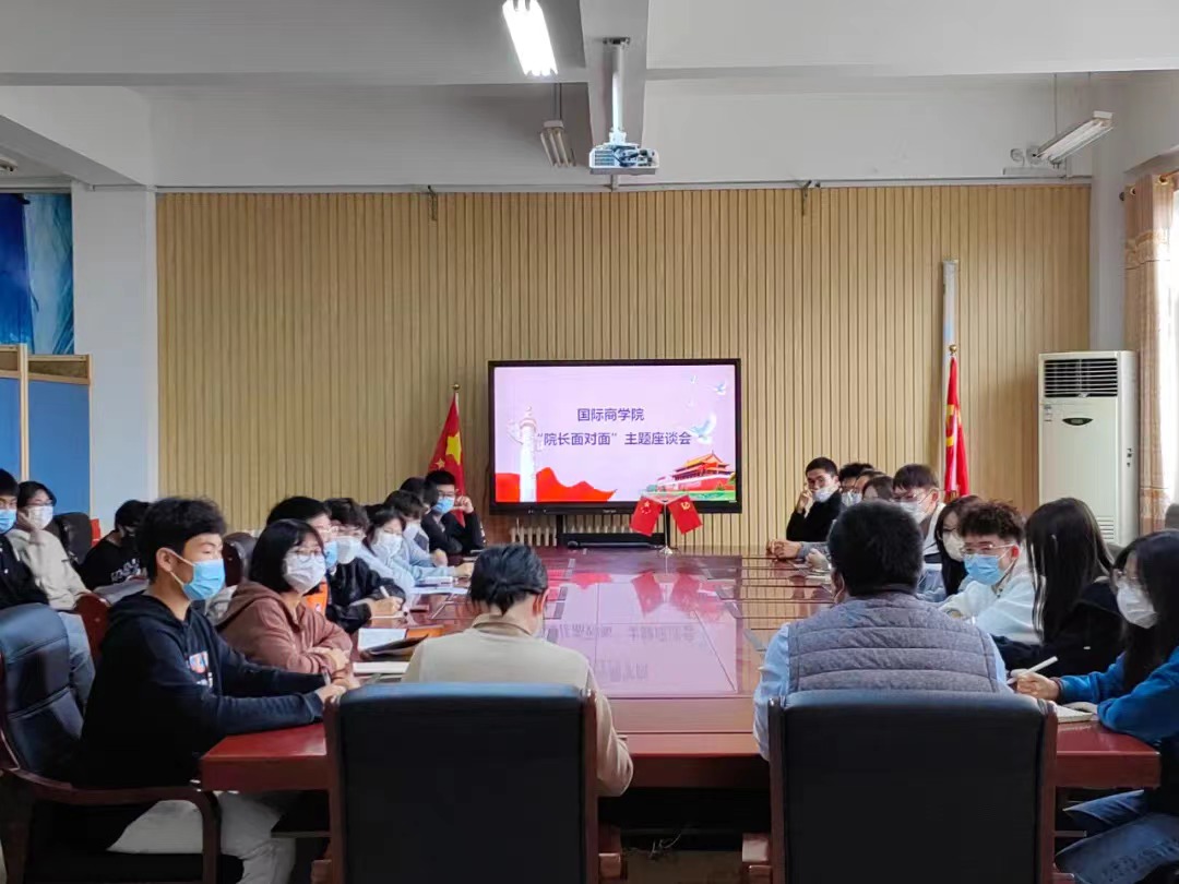 为了加强与同学们之间的交流,解决同学们生活中出现的问题,国际商学院于2022年10月26日下午14:00在知诚楼214开展“院长面对面”主题座谈会。参加本次会议的有国际商学院院长助理刘奕蔓院助、齐晓明院助以及国际商学院2022级各班班长。
