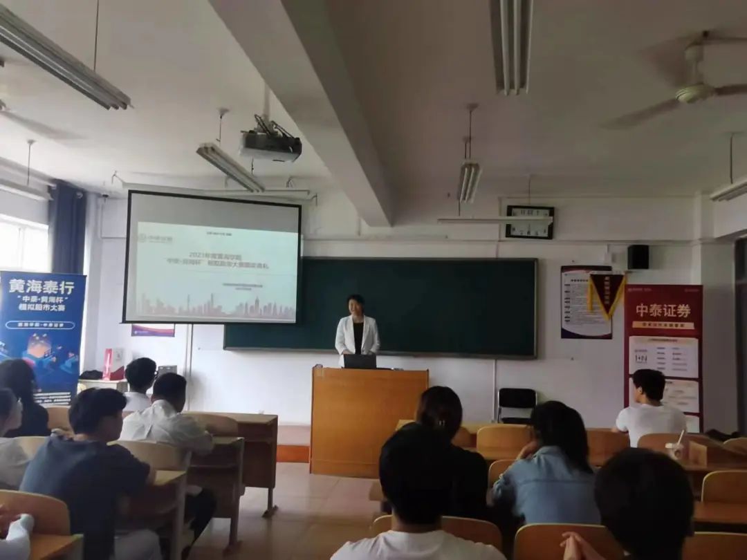 2023年6月14日,国际商学院财会金融系与中泰证券共同举办“中泰·黄海杯”模拟股市大赛颁奖典礼。国际商学院院长助理李燕、财会金融系主任姜作鹏和中泰证券蓝经理等人出席。