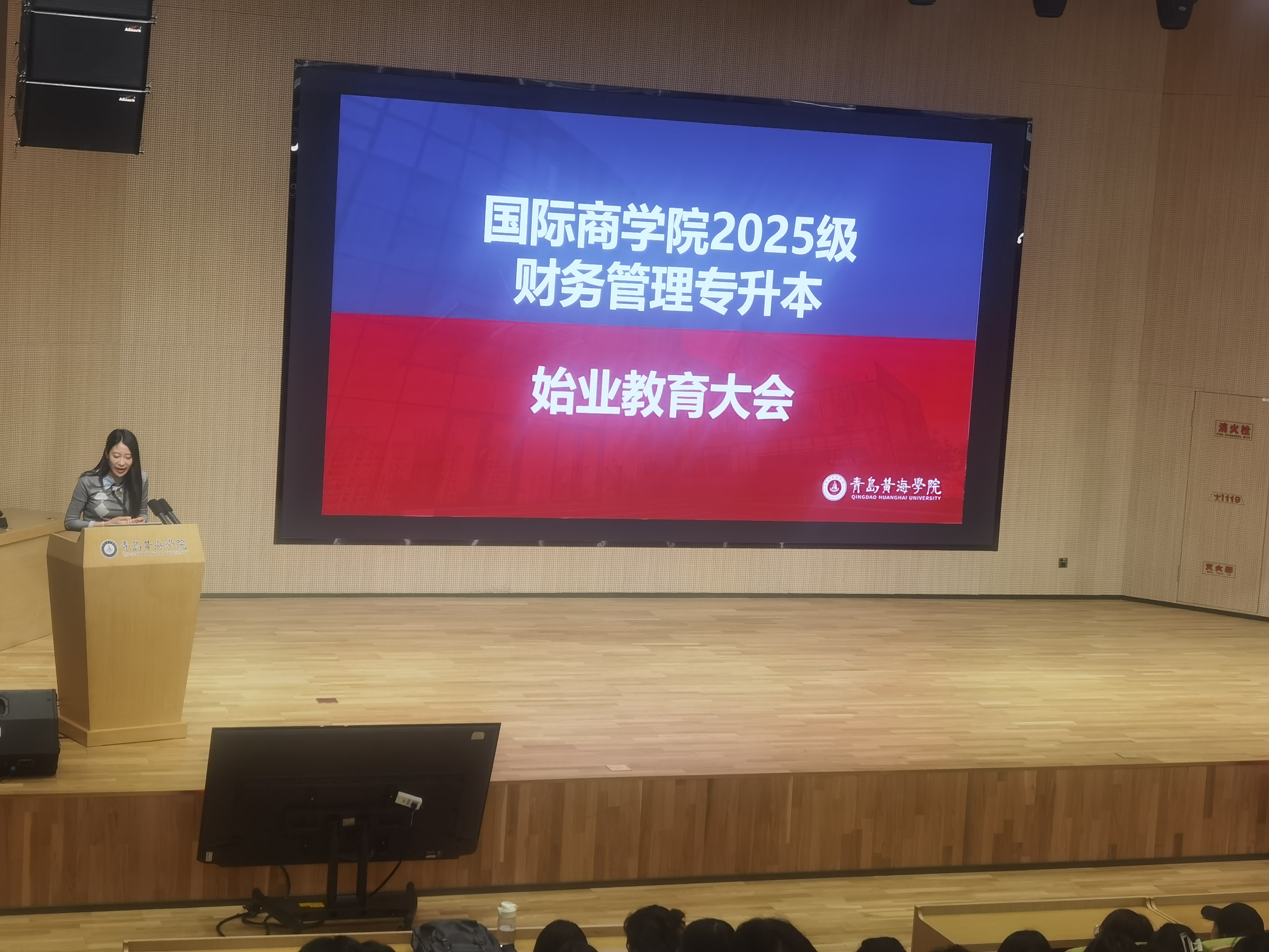 大会伊始,主持人祝天惠老师以热情洋溢的开场白,对全体新生的到来表示最诚挚和最热烈的欢迎。她表示,从专科到本科的跨越,不仅是学历层次的提升,更是知识结构、思维能力和职业素养的全面升华。选择黄海,选择财管,是同学们人生中的一个重要且明智的抉择。此刻的相聚,标志着一段充满机遇与挑战的新征程正式启航。