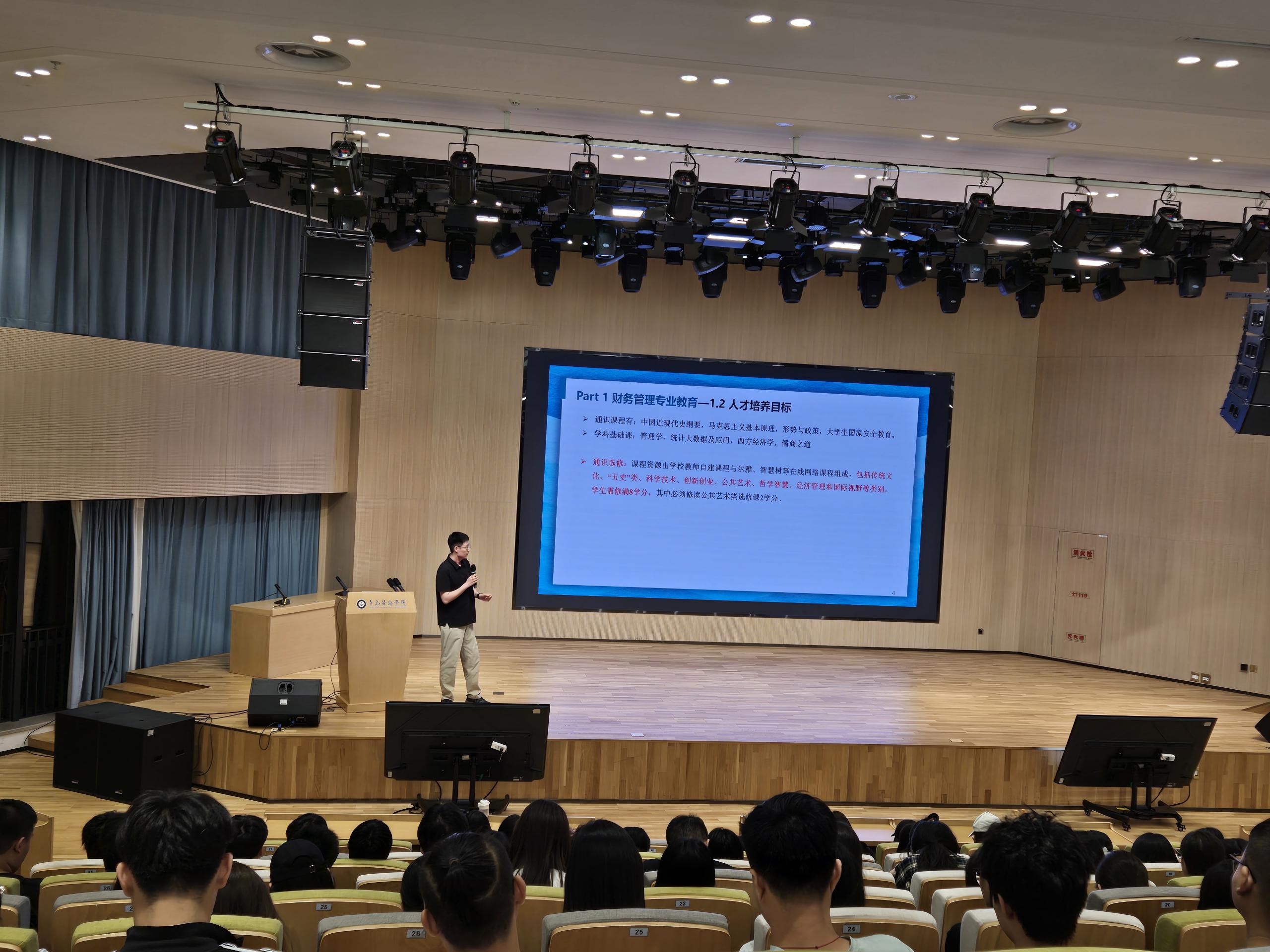 在课程体系介绍中,薛洋老师详细讲解了专业选修课的设置理念与学分修读要求,这也是本次始业教育大会的重点之一。“专业选修课并非随意选择,其与你们的职业规划息息相关。”薛老师强调,“每位同学必须修满一定数量的专业选修课学分方可毕业。这就要求大家不能仅仅凭兴趣或课程的难易程度来选课,而必须具有前瞻性和策略性。”他建议同学们:一要深入了解每门选修课的内容和教学目标;二要结合自身未来的就业意向(如从事企业财务、证券分析、审计还是金融科技等);三要考虑与职业资格证书(如CPA、CMA等)考试的衔接性,进行系统规划,形成属于自己的、有竞争力的知识技能组合。这番解读解开了许多新生关于“如何选课”的困惑,为他们自主规划学习路径提供了极具价值的指导。