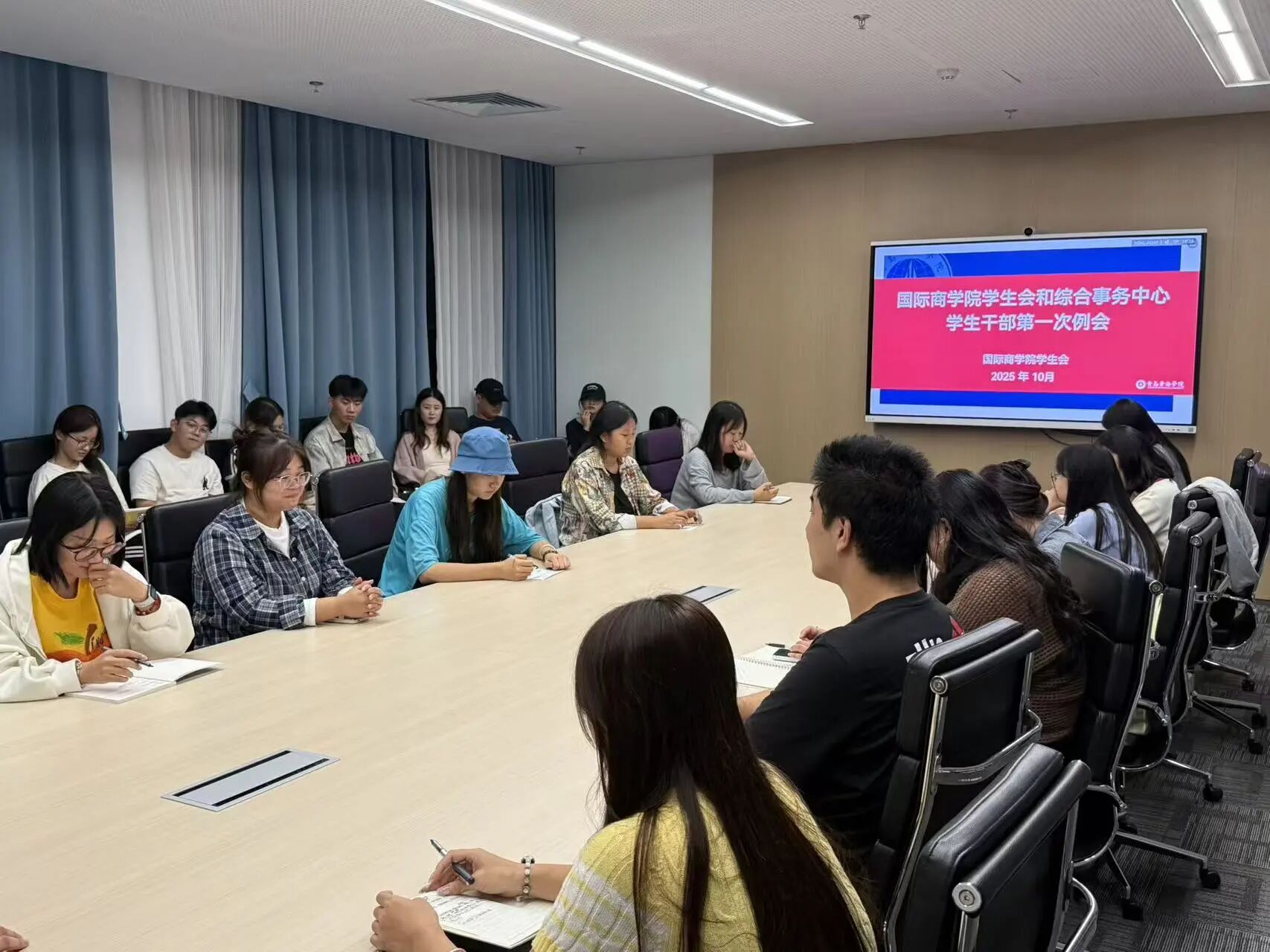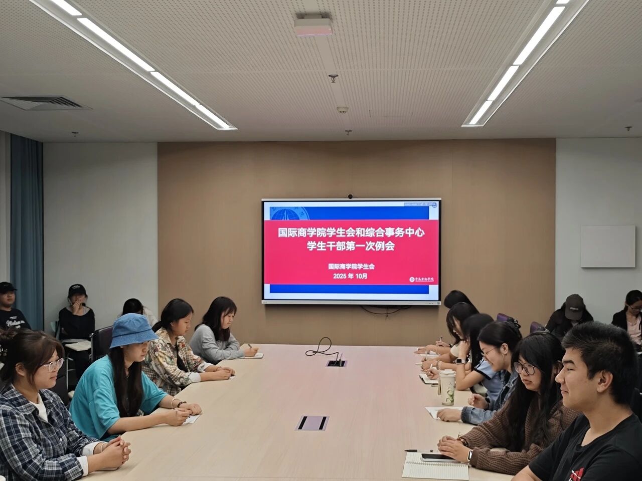 2025年10月9日晚18:30,国际商学院第七届第一次学生会干部例会在知信楼511会议室顺利召开。团委书记于小燕老师、学生会主席及全体学生会干部参会,共同为新学期学生会工作定方向、划重点。