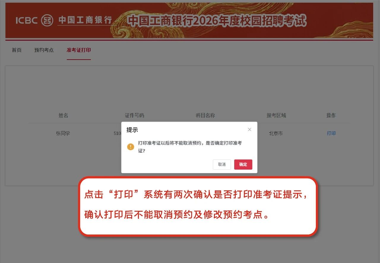 2. 打印准考证时点击“确定”按钮后,将不可修改考点预约结果;考生在准考证打印开放时间内可多次打印;
