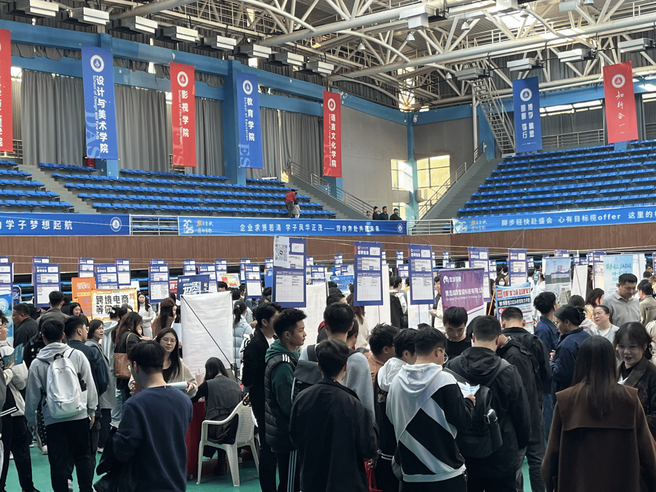 2025 年 10 月 29 日 14:00-17:00,以“'就'在金秋,'岗'好有你”为主题的 2025 秋季校园双选会在校体育馆盛大启幕。国际商学院积极参与本次活动,本次双选会精准对接专业人才培养目标,有效促进了学生与企业的深度交流。为学院国际经济与贸易、财务管理、市场营销等专业的1096名毕业生搭建起与企业沟通的桥梁。活动现场人气高涨、咨询踊跃,充分展现了国商毕业生的求职热情与企业对我院人才的高度认可。