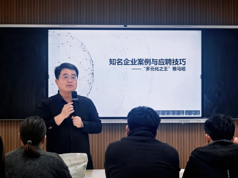 11月14日下午,青岛大学商学院张喆博士受邀走进国际商学院,在知信楼430教室为国际商务、市场营销等专业学子带来“知名企业案例与应聘技巧”专题讲座。张喆博士拥有管理科学与工程博士后流动站经历,长期深耕企业管理与创新创业管理领域,聚焦社会责任与企业价值关系研究,相关成果发表于多家核心期刊,理论与实践积淀深厚。