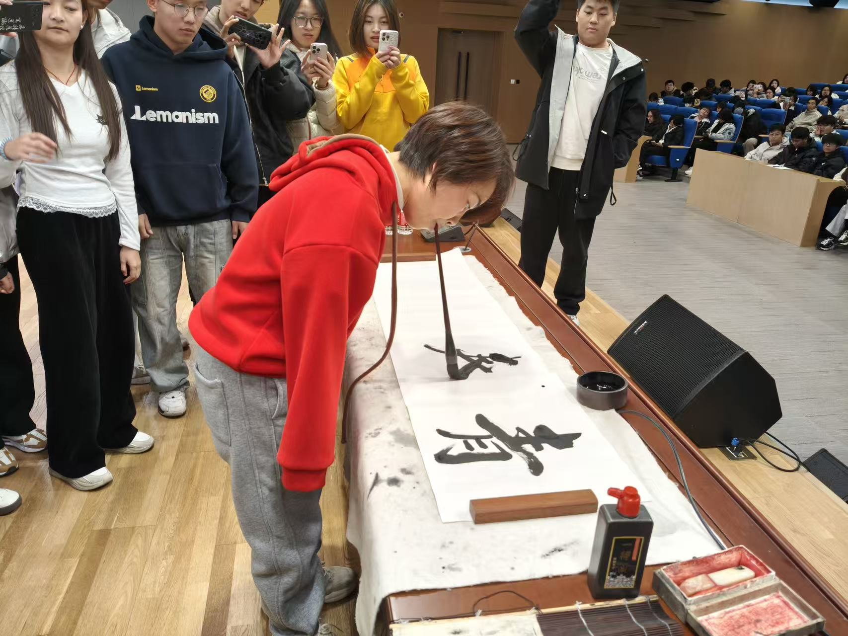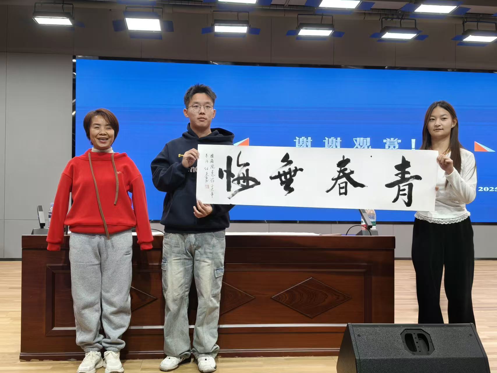 最后,刘老师亲自挥毫书写了一幅书法作品,并将其赠与大家。那笔墨之间,尽显坚韧与力量,仿佛是她对同学们无声而有力的鼓舞,激励着大家在面对人生挑战时,能如这书法一般,刚劲挺拔,勇往直前。