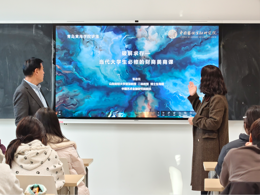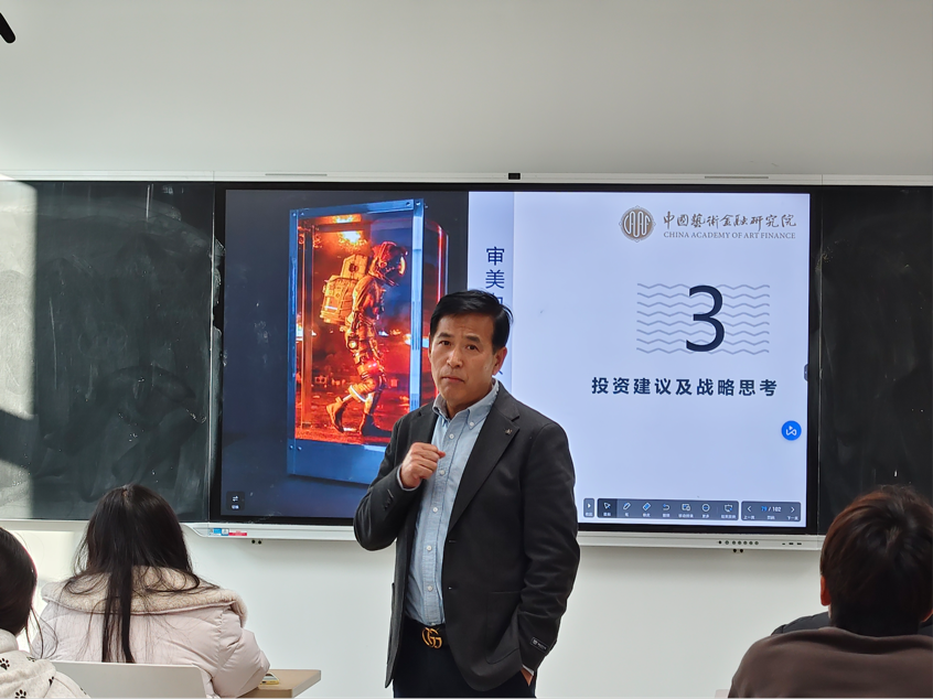 张志元教授首先详细了解了国际商学院的建设现状与未来发展规划,结合自身深厚的学术积淀和丰富经验,围绕学院学科建设、师资团队建设、科研项目申报及教学重心优化等关键领域提出针对性建议,为学院高质量发展提供了宝贵思路。在面向学生的专题授课环节,院长助理王佳璇先向金融科技专业学生介绍了张志元教授的学术背景与研究成果。随后,张教授以生动鲜活的案例为支撑,系统阐释了财商与美商的核心内涵及重要价值,明确提出“财商是创造价值,管理财富的认知、能力和素养;美商是审美的认知、素养和能力,更是精神创造财富的能力”,强调当代大学生应高度重视财商与美商的双重培养。结合自身研究领域,张志元教授还深入讲解了“艺术金融的发展逻辑”“艺术品投资实践”“艺术资产管理研究与人才培养”等专题内容,为学生搭建起专业知识与跨界应用的桥梁。互动交流环节,同学们踊跃提问,张教授耐心答疑解惑,现场氛围热烈融洽。