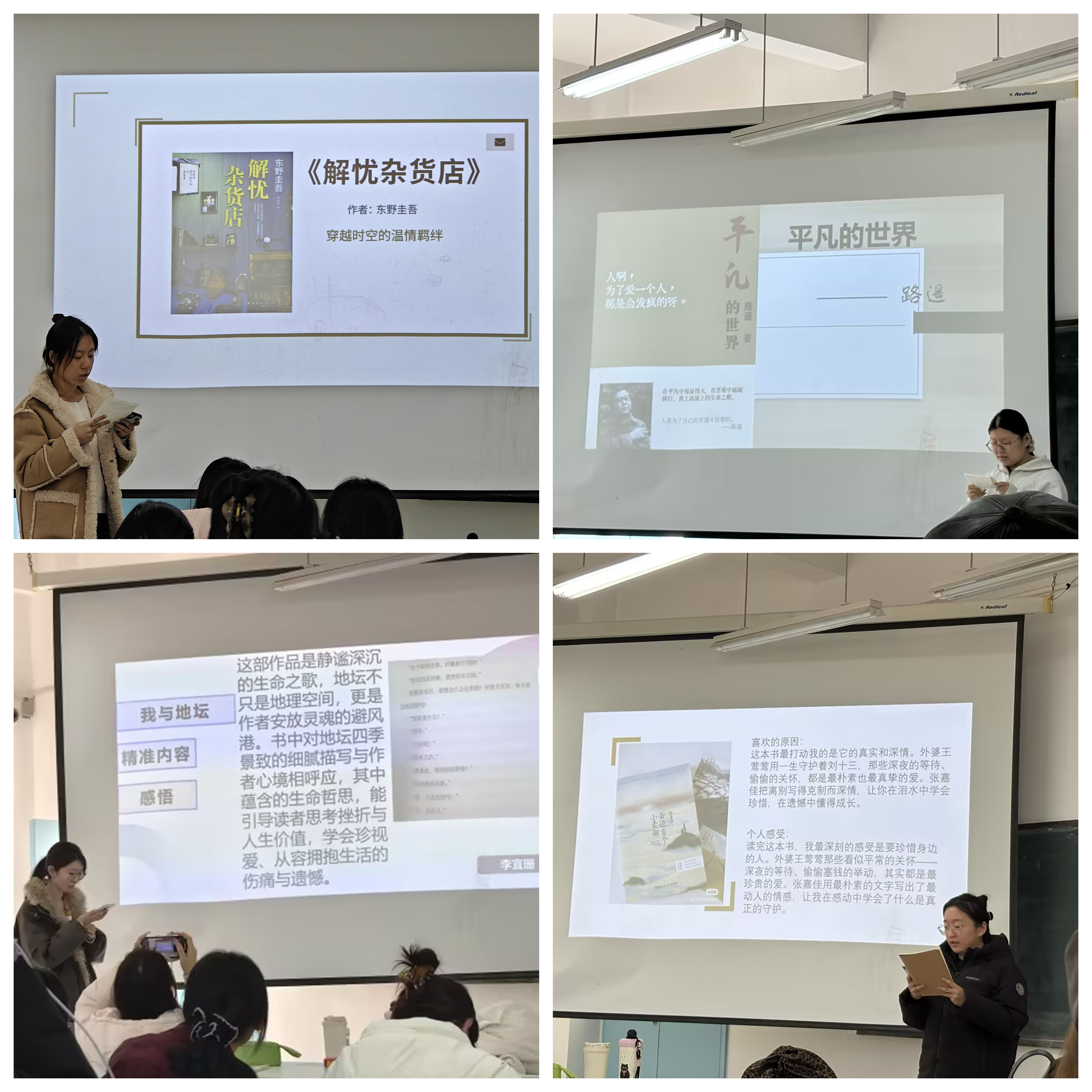在我喜欢的一本书环节,学生结合阅读体验,阐述书籍带来的思想启发与情感共鸣。王黎明、赵露露、潘立峰等同学围绕《骆驼祥子》《边城》《活着》的时代意义与文学价值展开分享,传递对中华优秀文化与时代精神的理解;王雅琪、秦小迪、魏孟迪、李函真等同学分享《牧羊少年的奇幻之旅》《解忧杂货店》《包法利夫人》《天才在左疯子在右》等书籍带来的成长感悟,表达对平凡生活中珍贵情感的重视,并结合个人思考提出行动认知;褚杨解读《自卑与超越》中被讨厌的勇气中的心理学观点,分享对自由与自我成长的理解。