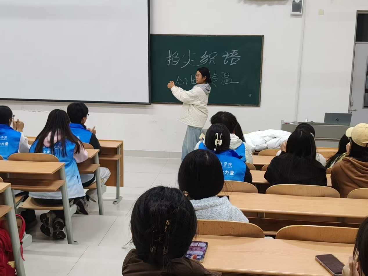 紧接着大家在志愿者的耐心指导下,逐词学习基础手语动作。从简单的“你好”、“谢谢”,到表达情感的“爱”与“温暖”,同学们认真模仿、积极跟练,在指尖的舞动中感受着非言语沟通的独特魅力。