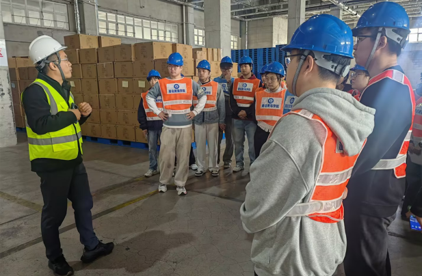 在参观过程中,企业经营部长任百富担任现场讲师,他结合仓库内的实际运作场景,为同学们详细拆解了仓储业务流程。从货物入库的验收、上架,到出库的拣选、复核,任部长用通俗易懂的语言和生动的案例,让学生们直观了解了保税物流与供应链保障服务的具体操作规范。