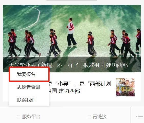 【 方 式 二 】进入“西部志愿汇”微信公众号,点击菜单栏中的“我要报名”,进入西部计划信息系统。