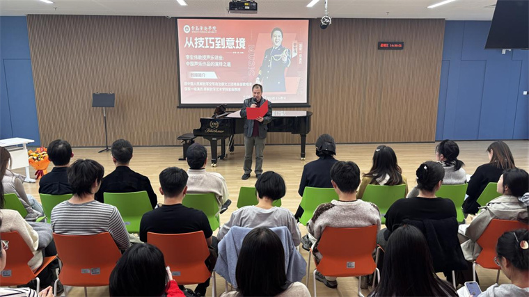 在讲座中,李宏伟教授结合自己丰富的舞台经验和教学心得,深入浅出地讲解了声乐演唱从技巧训练到艺术意境表达的提升路径。通过具体作品的分析和示范,生动展现了声乐艺术的魅力,现场师生反响热烈。