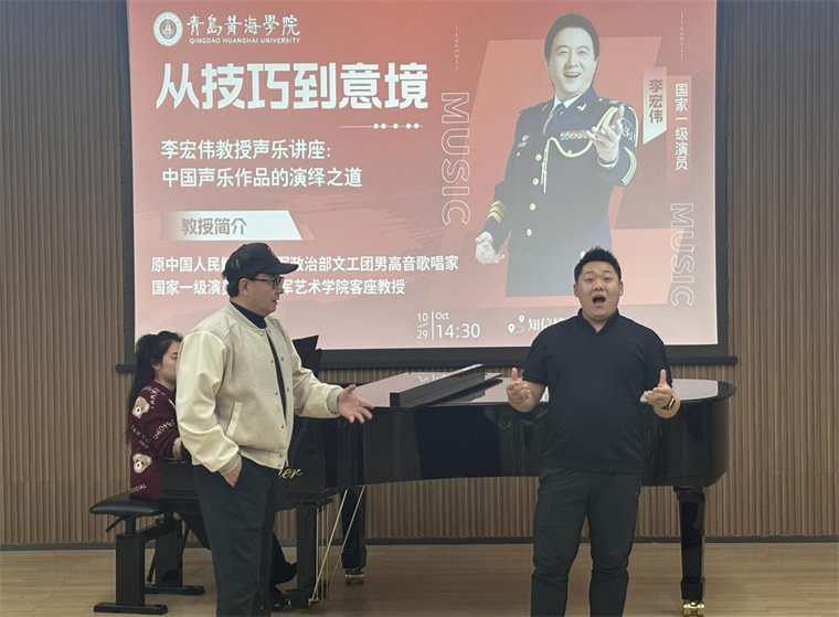 下午,李宏伟教授在知信楼134教室开展了题为《从技巧到意境——中国声乐作品的演绎之道》的专题声乐讲座。活动由左浩博主任主持。青岛黄海学院副校长马延岳、教育学院副院长刘艺敏、院长助理张若愚及音乐教育专业师生出席。同时邀请了中国石油大学、山东科技大学师生,以及青岛西海岸新区朝阳小学、富春江路小学、昆仑山路小学、团结路学校等校际合作单位教师代表观摩,促进校际交流与协同育人。