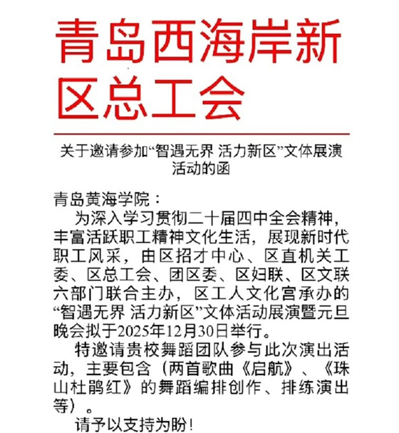 12月30日下午,由西海岸新区招才中心,西海岸新区直机关工委,西海岸新区教育和体育局,西海岸新区总工会等六部门联合主办,区工人文化宫承办的“智遇无界 活力新区”文体活动展演暨元旦晚会在港湾职业技术学院A0报告厅隆重举办。由我院贾悦扬、朱姗姗教师指导的灵海舞团受新区总工会邀请,以精湛的舞艺为晚会演出增添了一抹亮丽的青春色彩。这场演出不仅展现了高校美育实践的丰硕成果,更彰显了新时代美育与思政教育协同育人的创新路径。
