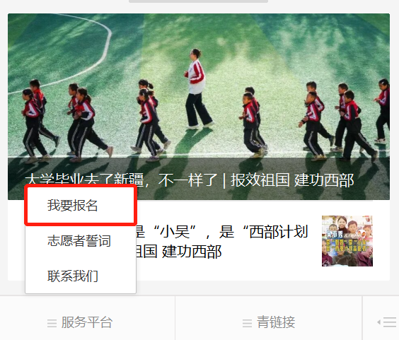 【 方 式 二 】进入“西部志愿汇”微信公众号,点击菜单栏中的“我要报名”,进入西部计划信息系统。
