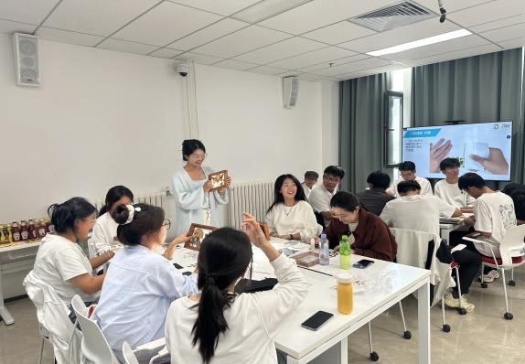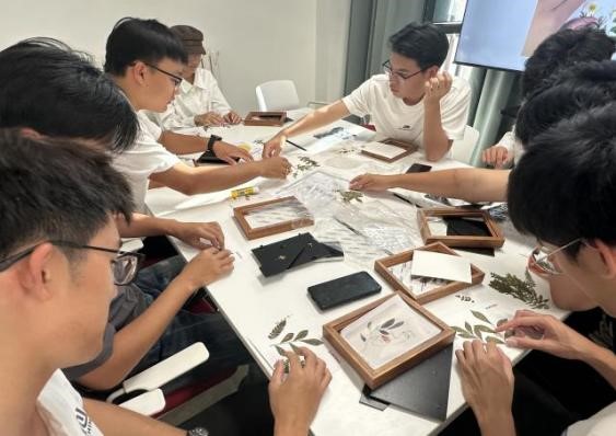课程尾声的“一叶成林”手工创作,将课堂氛围推向高潮。同学们用树叶、干花、冷裱膜等材料,先剪裁树叶调整造型,再拼贴出层次丰富的画面,最后覆上冷裱膜制成专属伴手礼。有的拼出“森林小径”,有的勾勒“花鸟图景”,指尖翻飞间,一片片普通树叶蜕变成充满创意的环保作品,大家举着成品拍照分享,成就感满满。