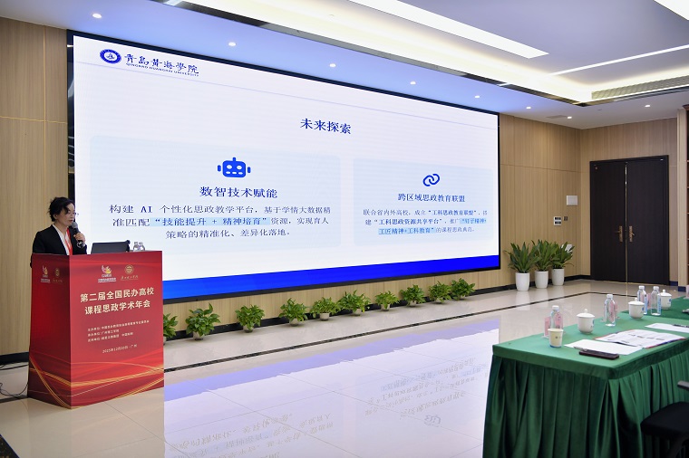 在大会专题报告环节,智能制造学院副院长周淑芳代表学校作了题为《铸魂工科领航育人——青岛黄海学院“双域三段四维”课程思政体系的创新实践》的精彩报告。她首先介绍了学校深厚的办学积淀,以及以“优秀传统文化、红色革命文化、大国工匠文化、创新创业文化”四文化融合育人的特色体系,为工科专业课程思政创新奠定了坚实基础。