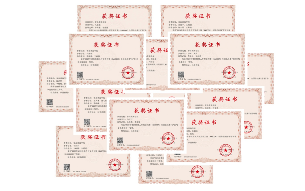 青岛黄海学院智能制造学院学子在2025年睿抗机器人开发者大赛共获国家级奖项14项,其中荣获国家级一等奖3项,二等奖4项,三等奖7项。