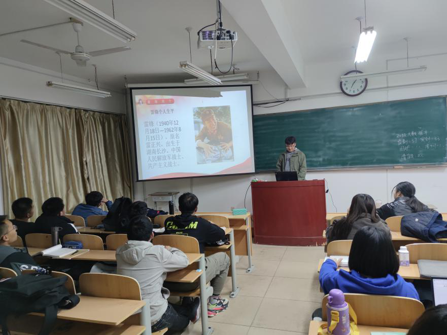 在各班团支书的带领下,各班同学集体进行了“弘扬雷锋精神”主题团课,同学们一起通过PPT了解到了雷锋的生平简介,将雷锋精神深深扎根在自己的骨髓。
