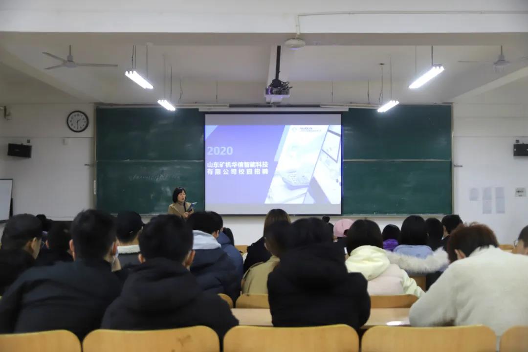 签约仪式结束后,山东矿机华信智能科技有限公司总经理钱峰涛和人事经理邹文科到教室进行企业宣传会,给同学们介绍公司现状、观看公司文化宣传片,与同学们进行交流、对同学们提出的问题进行解答和现场招聘。