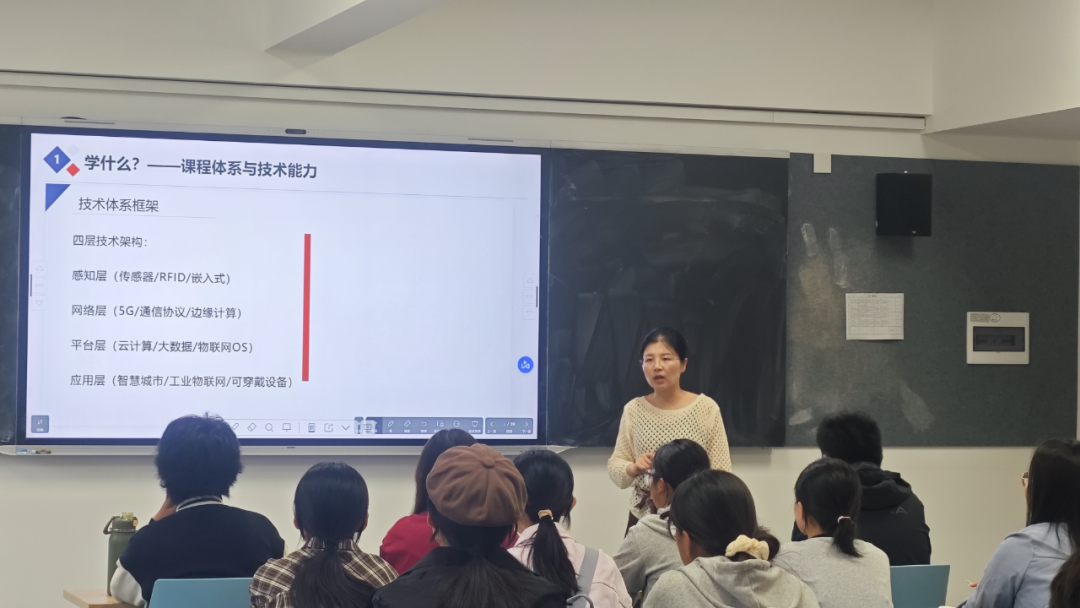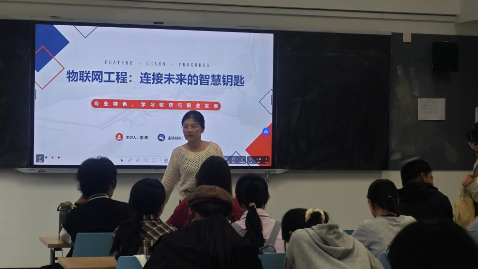介绍会伊始,物联网工程系主任李翠老师以“物联网工程:连接未来的智慧钥匙”为主题,向新生们阐述了专业的宏观价值与时代意义。她指出,我们正站在“万物互联”时代的入口,物联网作为核心技术,是推动智慧城市、工业4.0、智能家居等领域变革的引擎,市场潜力巨大,专业前景无比广阔。
