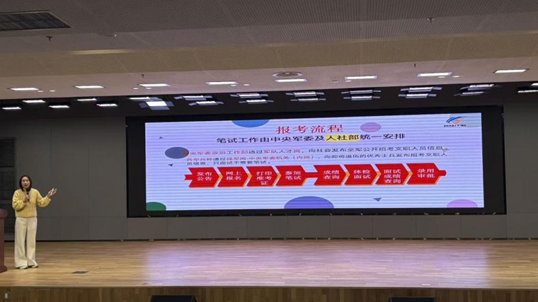 小蕾老师首先介绍了军队文职人员的基本定位、性质和在军队建设中的重要作用。她详细阐述了文职人员的职业发展路径、工资待遇、福利保障(如住房、医疗、子女教育等)以及享有的尊崇社会地位,让同学们对军队文职这一职业形成了全面而积极的初步认知。她强调,对于信息科学与工程相关专业的同学而言,军队的信息化、智能化建设正急需大量专业技术人才,同学们的所学专业与此高度契合,拥有广阔的施展才华的空间。