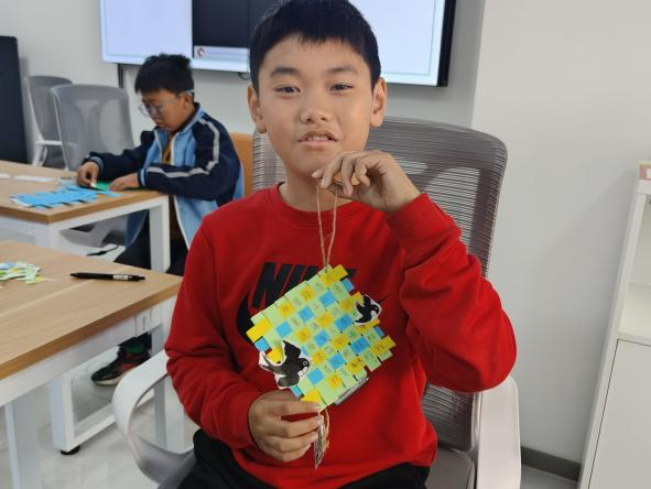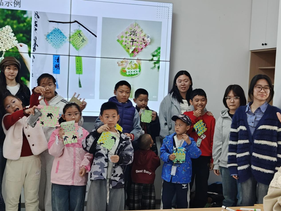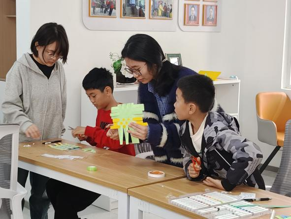 最后,志愿者与孩子们一起制作清明主题纸编挂件。大家先将彩纸剪成14条等长纸条,随后在志愿者的指导下交错编织成小网格,最后用彩笔和贴纸装饰上青团、柳枝等清明元素。孩子们捧着自己的作品,在动手实践中感受传统节日的乐趣。