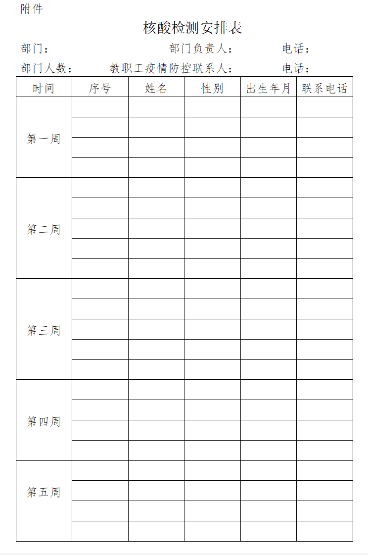 十二、各单位、各部门按照每周5%的比例排列出本部门教职工参加核酸抽检工作的安排表,为抽检工作做好准备。