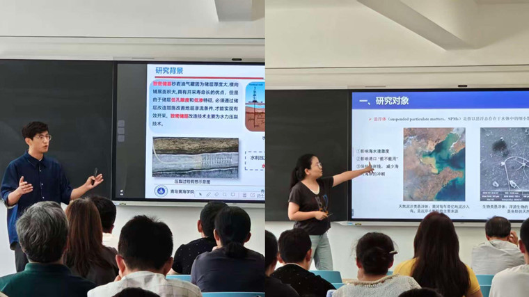 史兴宇博士围绕海洋悬浮体展开分享:一是大洋海山区地形如何通过改变流场、温盐结构等物理环境,影响悬浮体的垂直分层与水平聚集规律;二是山东半岛沿岸海域中,黄河径流、季风潮汐等自然因素与港口建设、海水养殖等人类活动共同作用下,悬浮体的季节变化与空间分布特征。