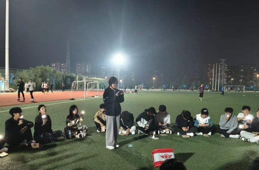 晚风习习,同学们三五成群,围坐在操场的草坪上。手机手电筒化作点点“星光”,随着旋律轻轻摇摆。这里没有专业的音响设备,只有一位同学带来的便携蓝牙音箱;这里也没有固定的歌手,每一位热爱歌唱的同学都是当晚最耀眼的主角。