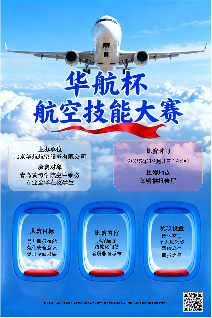 青岛黄海学院空中乘务专业,联合北京华航航空服务有限公司,重磅推出 “华航杯” 航空服务技能大赛!从初赛的形象展示、广播词播报,到复赛的客舱服务考核、结构化问答,再到决赛的机上急救、安全应急处置,每一轮都是提升自我的绝佳舞台。