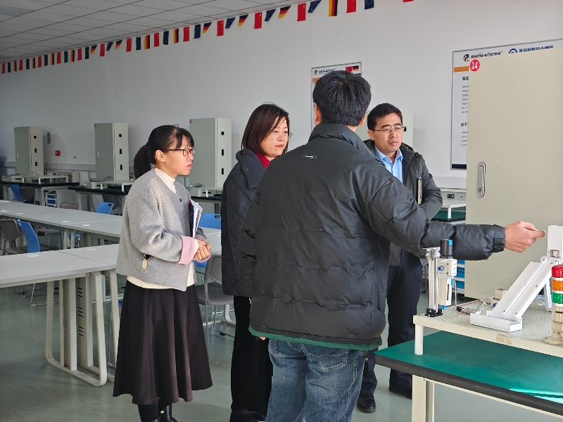 在金跃云主任的陪同下,杨晓磊院长带领调研团队先后参观了企业生产车间与教学教室、实训室。在生产车间,调研团队实地察看各类生产设备,深入了解企业生产运营流程;在实训室,金跃云主任现场演示了机电一体化相关实训设备的操作流程与功能特点,直观展现了企业在实践教学方面的硬件优势。
