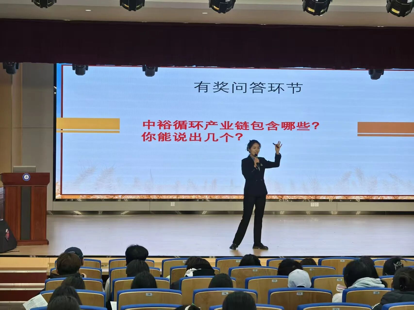 在互动性极强的“有奖问答”环节,宣讲人抛出“中裕循环产业链包含哪些环节”的问题,现场学子纷纷举手抢答,不少同学精准说出了“初加工、食品加工、深加工、废弃物综合利用”等板块,既展现了对企业信息的关注,也让现场气氛推向高潮。而在餐饮业务介绍环节,当听到企业门店覆盖多省市、服务260余家机关餐厅时,台下学子们的眼神里多了几分期待与向往。