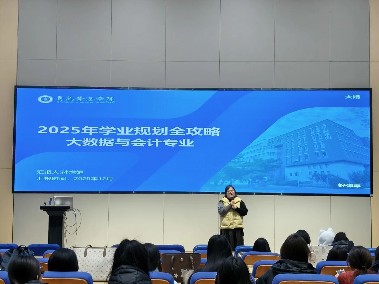 为引导新生科学规划大学生涯,明确专业学习方向,12月7日晚,由学院精心组织的“2025年学业规划全攻略——大数据与会计专业专题报告会”在知行楼434报告厅成功举行。本次报告会由丰富教学与学生指导经验的教学主任孙增娟担任主讲,为同学们带来了一场内容丰富、务实启发的学业导航。