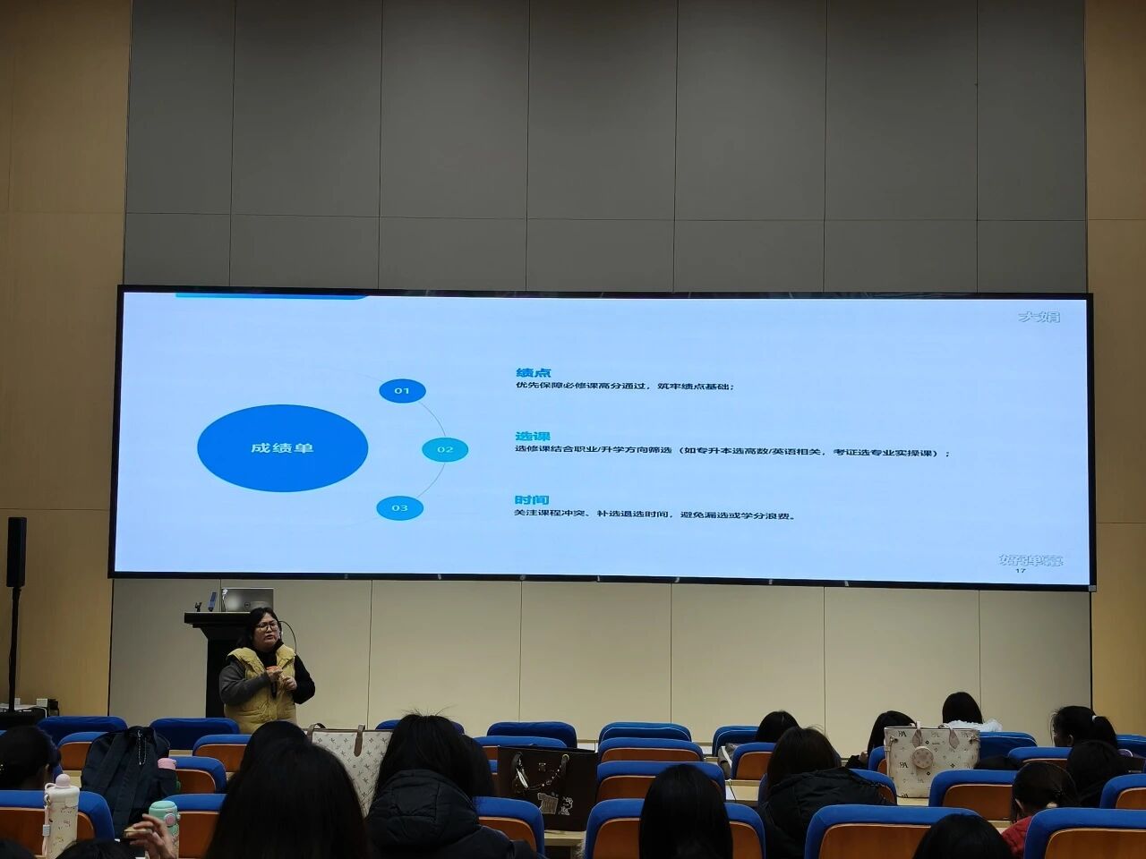 在“学业导航与成绩单深度解析”环节,孙主任详细讲解了学分构成、绩点计算方法及其深远影响。她着重强调了“成绩不仅是分数,更是学习态度、知识掌握程度和综合能力的体现”,优异的成绩单是未来升学、求职、评奖评优的坚实基础。她同时提醒同学们要时刻“遵规守纪”,良好的行为记录是大学生一切发展的前提。