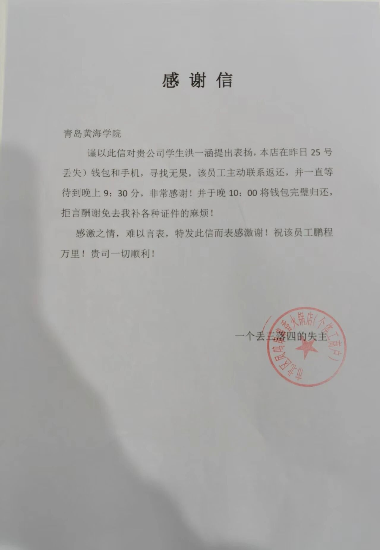 为表达感激之情,失主特地写下感谢信寄至青岛黄海学院,字里行间满是对洪一涵同学的认可与赞扬。信中不仅提及洪一涵的拾金不昧,更称赞其耐心等候的真诚态度,这份善意让失主倍感温暖。