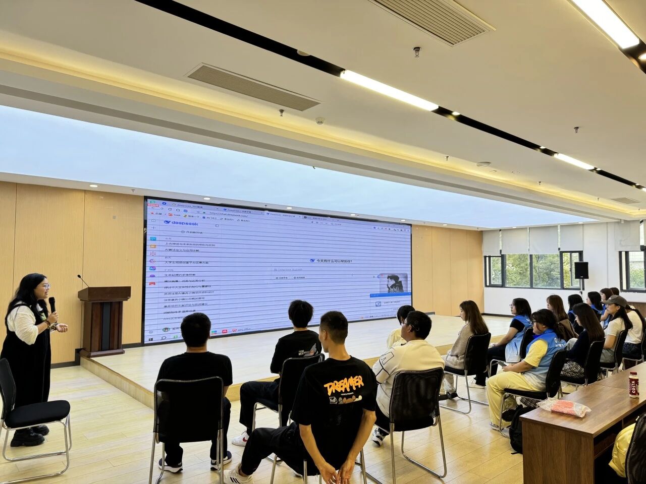 作为活动发起方之一,“小黄锋”志愿者协会全程保障活动落地:志愿者们提前布置场地、调试设备,活动中协助专家开展互动引导,还会为有疑问的学生提供一对一答疑,用耐心与热情营造轻松的学习氛围。现场设置的交流环节,更让学生能分享AI使用困惑、交流学习心得,在思想碰撞中深化对AI应用的理解。