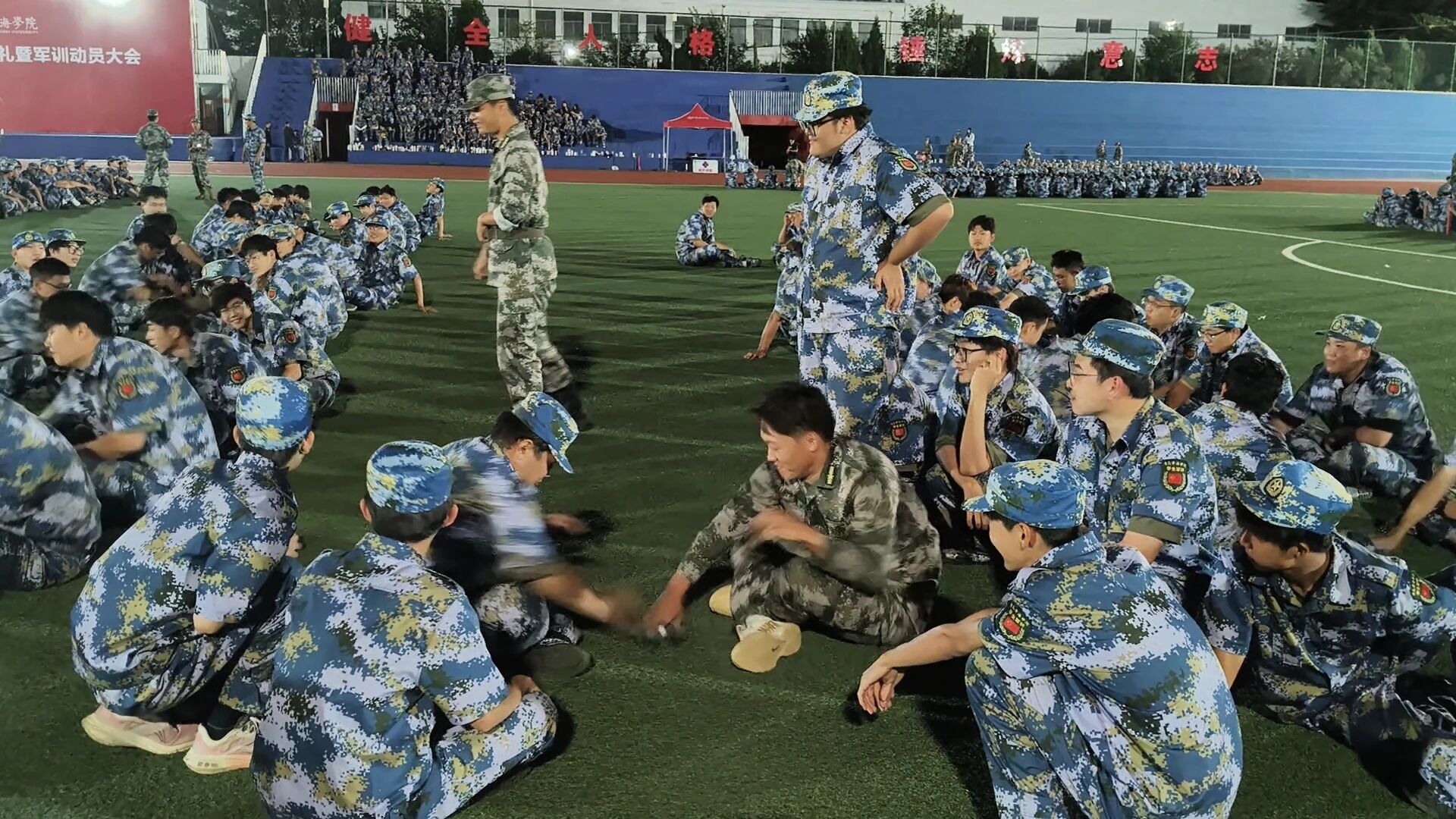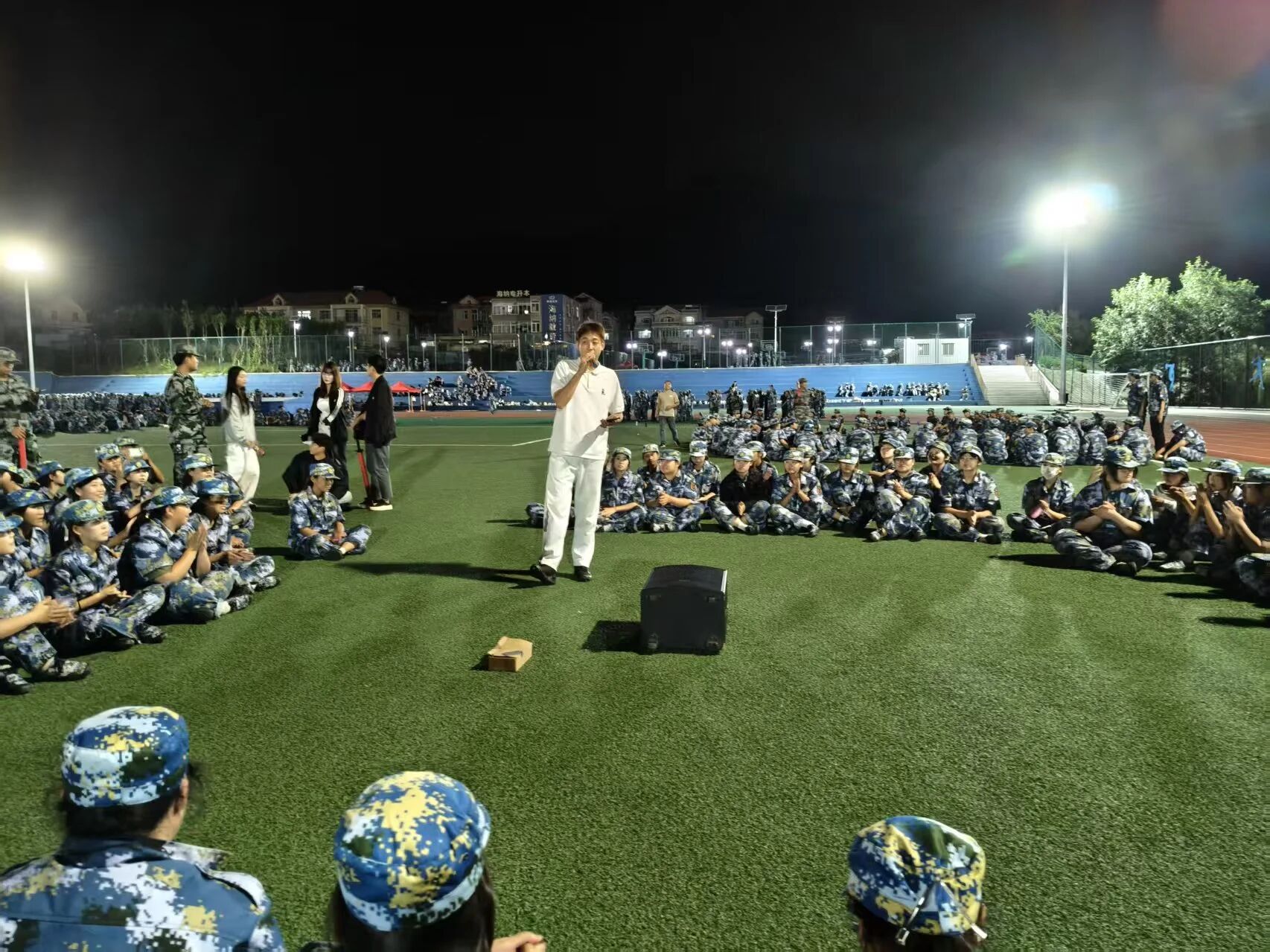 9月18日,今晚的风终于吹散了白天的燥热,也把我们从站军姿、踢正步的紧张里拉出来,夜晚的操场,并未因此沉寂,反而被一阵阵欢声笑语所充盈!