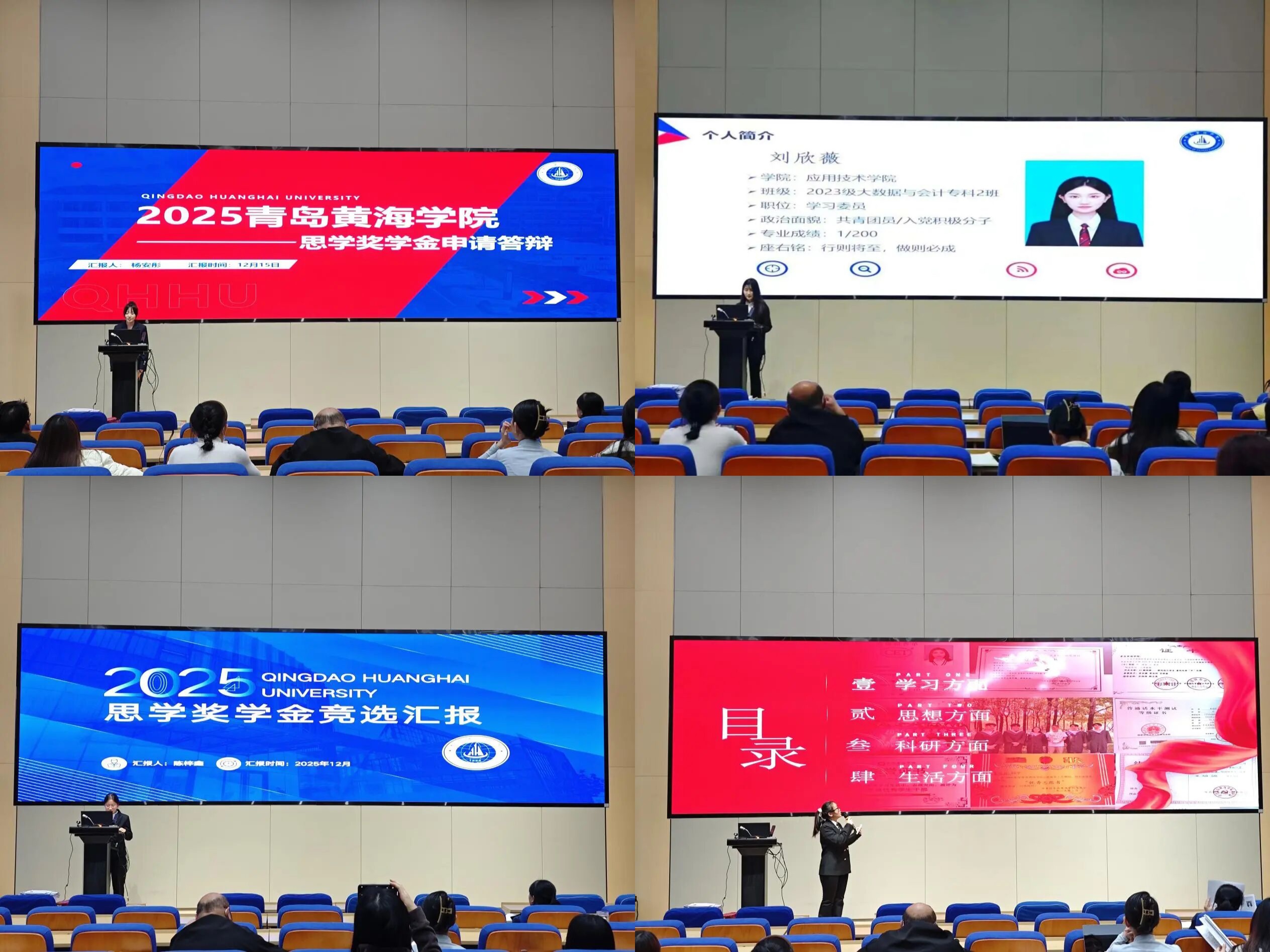 思学奖学金作为学院激励学子勤学善思、全面发展的重要载体,吸引了应用技术学院各专业优秀学子踊跃参与。冠军得主刘欣薇表现尤为突出,她以91.4的加权成绩稳居专业排名第一,不仅在全国大学生英语竞赛、校新生辩论赛等赛事中屡获佳绩,更以“专科不是终点,奋斗方遇花开”的坚定信念,诠释了新时代青年的逐梦担当。中共预备党员贾信玥连续斩获国家奖学金、山东省政府奖学金,在科研立项、志愿服务领域全面发展,年级专业排名第三的优异成绩与多项荣誉加持,尽显德才兼备的学子本色;陈梓鑫作为ERP经营管理协会骨干,在组织协调与实践创新中锤炼本领,校外实践中亦展现出较强的专业应用能力;杨安彤荣获校级“优秀学生干部”“雷锋式个人”等称号,以高尚品德与服务精神成为同学楷模;舒凯瑞因家人生病住院未能亲临评审现场,学院通过播放VCR的方式完成其成果展示,他在视频中呈现的学习规划与成长感悟,展现出的坚韧向上的学习态度与成长潜力,同样获得评审团队的认可。