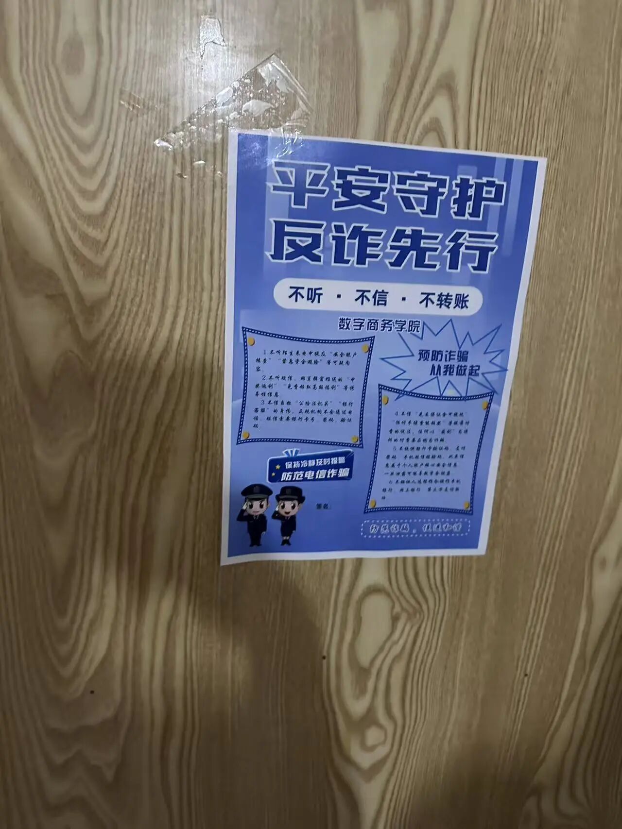 2025年9月15日,数字商务学院进行反诈骗宣传。随着互联网的普及,电信诈骗手段层出不穷,给我们的财产安全带来了严重威胁。为了提高大家的防范意识,提高自我保护能力,我们在宿舍内张贴了反诈宣传单。