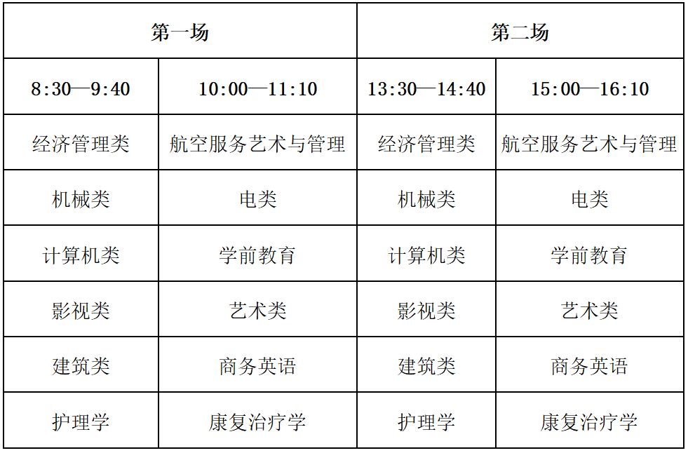 1.为方便考生,我校每个专业(类)上午、下午各安排一场考试,考生可自主选择其中一场或多场参加测试,但测试科目相同的专业(类)只有一次考试机会。