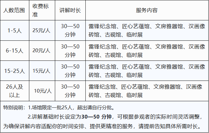 青岛黄海学院博物馆面向非本校群体(包括央国企、高校、银行以及社会组织的参观群体等)、培训班、以盈利为目的组织参观的各种单位和机构(含政务单位、本校群体)收取讲解服务费。