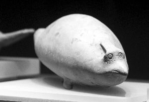 展厅中,一件灰色的陶壶,长着像鸟一样尖尖的嘴巴,两只眼睛圆溜溜的,有点害羞,有点囧。南博专家说,这件文物叫江豚形陶壶,1960年在吴江出土。这个“江豚”长32.47厘米。用的时候,用翘起来的尾巴把水注进去,由三足作为支撑。”圆滚滚的“身子”,加上一副茫然的表情,紧闭的尖嘴,好像心里在不停吐槽,“囧”得可爱。